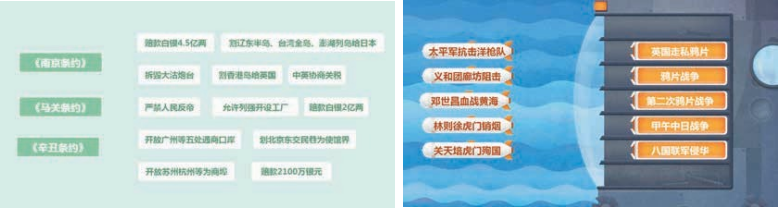 针对同学们所需要掌握的基本知识,例如:各个不平等条约所包含的内容、历史事件所对应的历史时期等内容,单纯记忆起来是有些枯燥的,但我巧妙地将这些知识点融入希沃白板5中的课堂活动,有效增加了练习的趣味性。同时,通过易课堂的课件推送将互动式的课件推送给了每一位学生,让大家都能在自己的平板上完成相应的练习,在游戏式的动手操作中对知识内容进行了解和记忆。