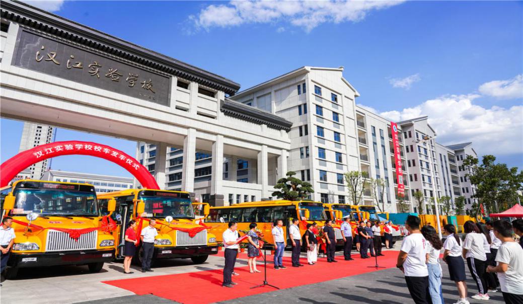 我校隆重举行校车发车仪式,目前我校共有十二辆校车,有六条市内通勤线路,四条县际通勤线路。