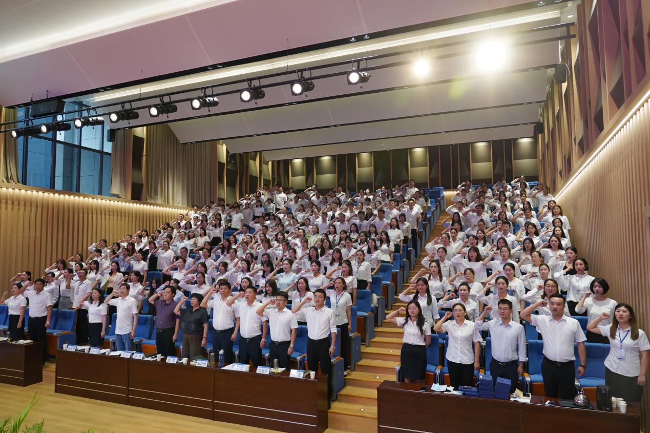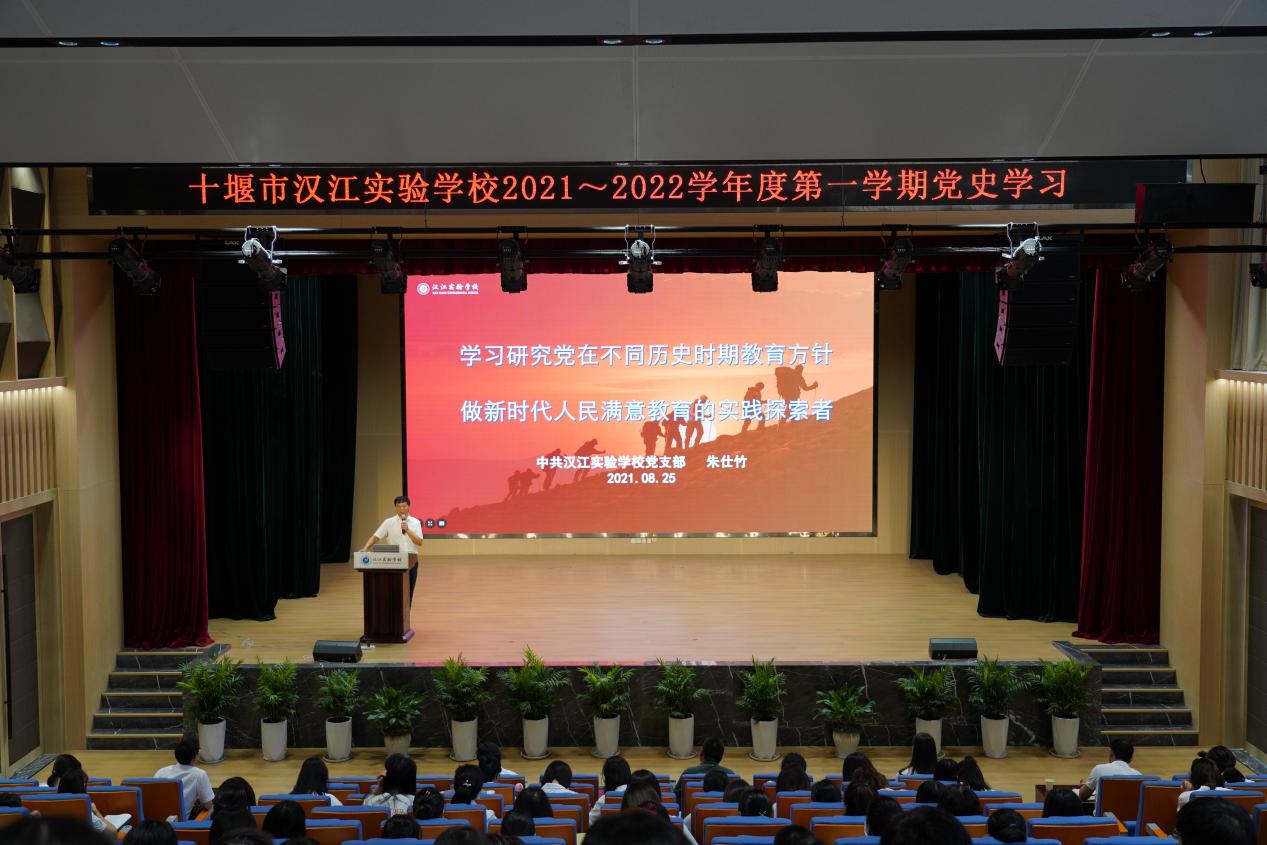 强师德建设,铸育人品牌。汉江实验学校校长朱仕竹以《齐心合力,走品牌强校之路》为主题,详细介绍了我校校园文化、品牌内涵、核心竞争力、品牌建设等内容,为全体教职工指明了学校未来发展的方向;以《学党史、跟党走、铸初心》为主题,带领全体教职工学习、研究党在不同历史时期的教育方针,激励大家以德施教、以德立身,争当新时代教育的实践者、探索家。
