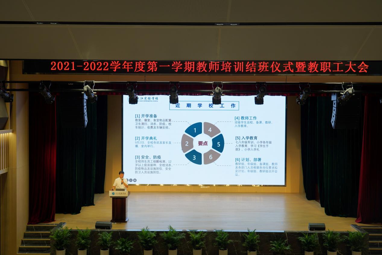 2021年8月27日下午,我校在报告厅隆重举行了2021-2022学年度第一学期教师培训结班仪式暨教职工大会。汉江实验学校董事长何蕾、校长朱仕竹、副校长陈伟、陈磊、王宇、张旭东出席,全体教职工参会。