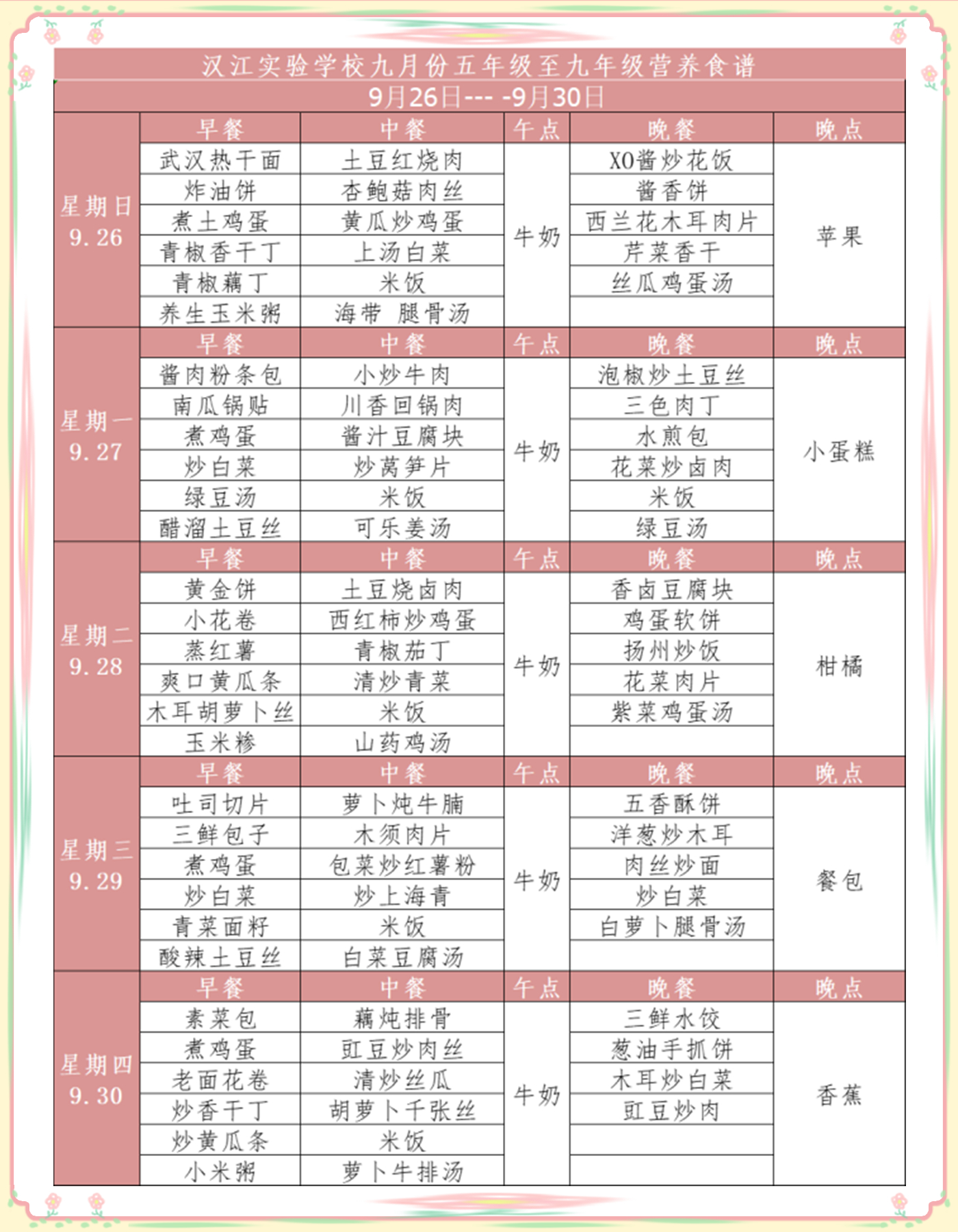 汉江实验学校2021年9月26日-2021年9月30日学生食谱公示