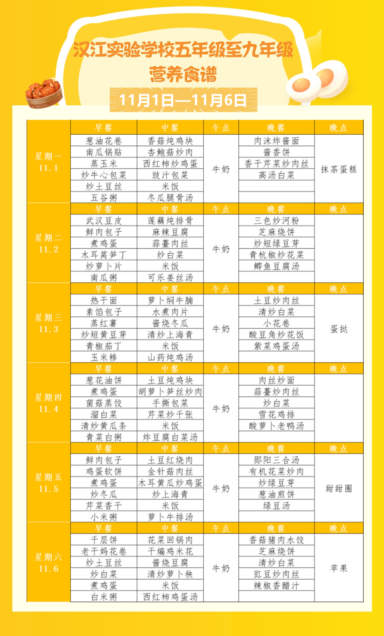 汉江实验学校2021年11月1日-2021年11月6日学生食谱公示