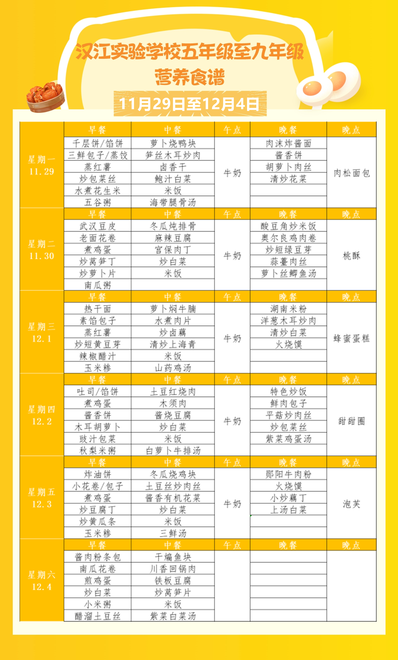 汉江实验学校2021年11月29日-2021年12月4日学生食谱公示
