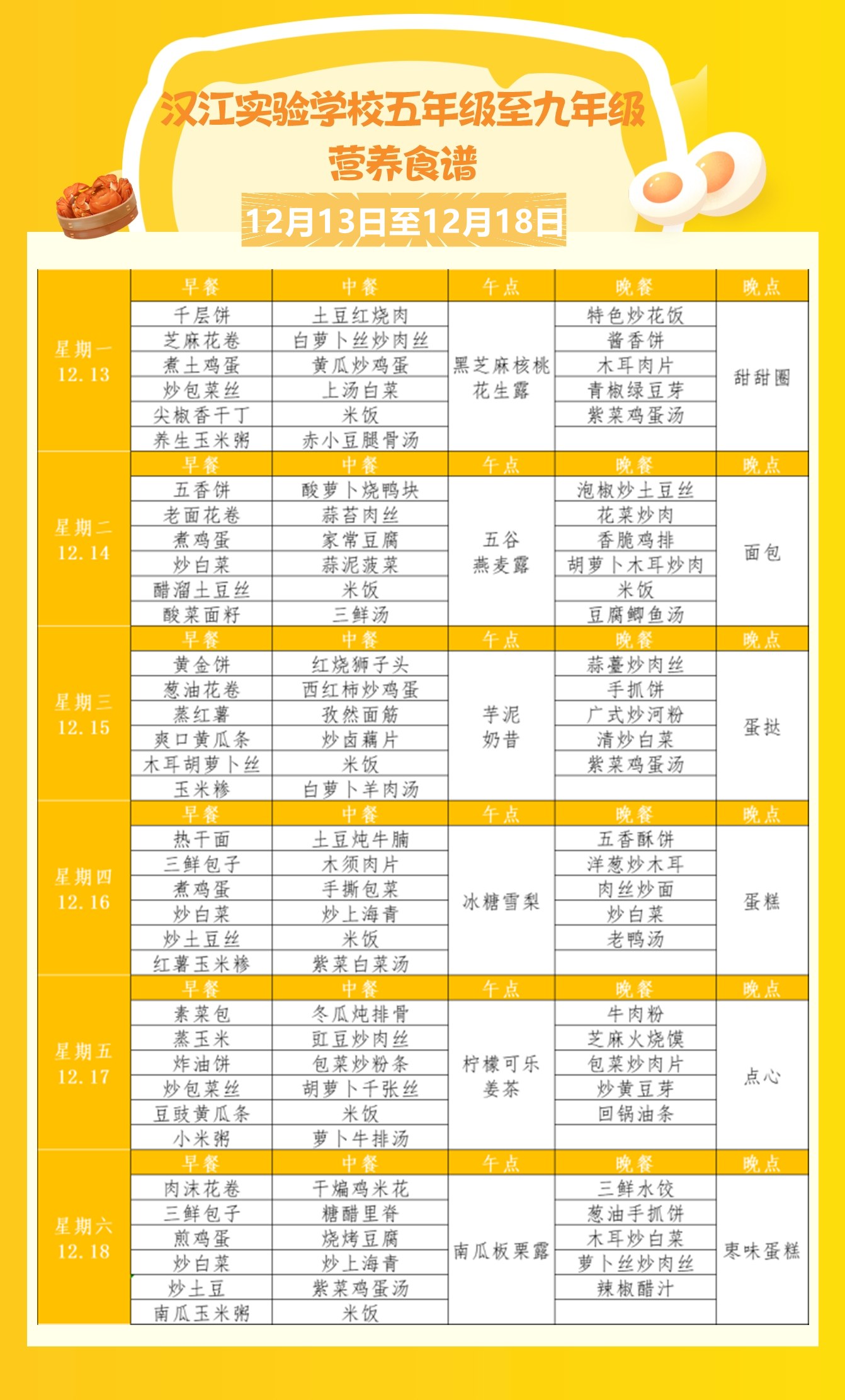 汉江实验学校2021年12月6日-2021年12月11日学生食谱公示