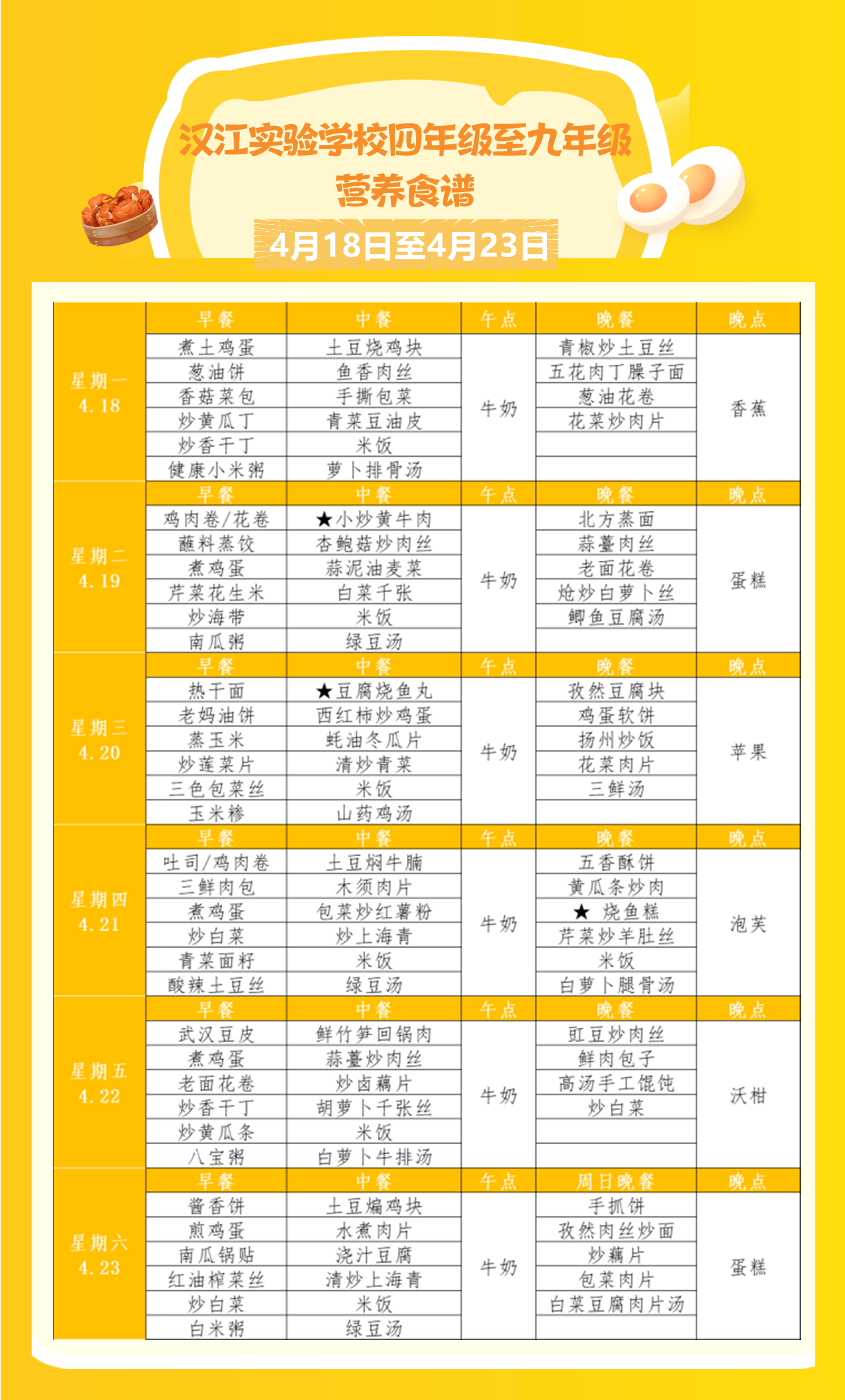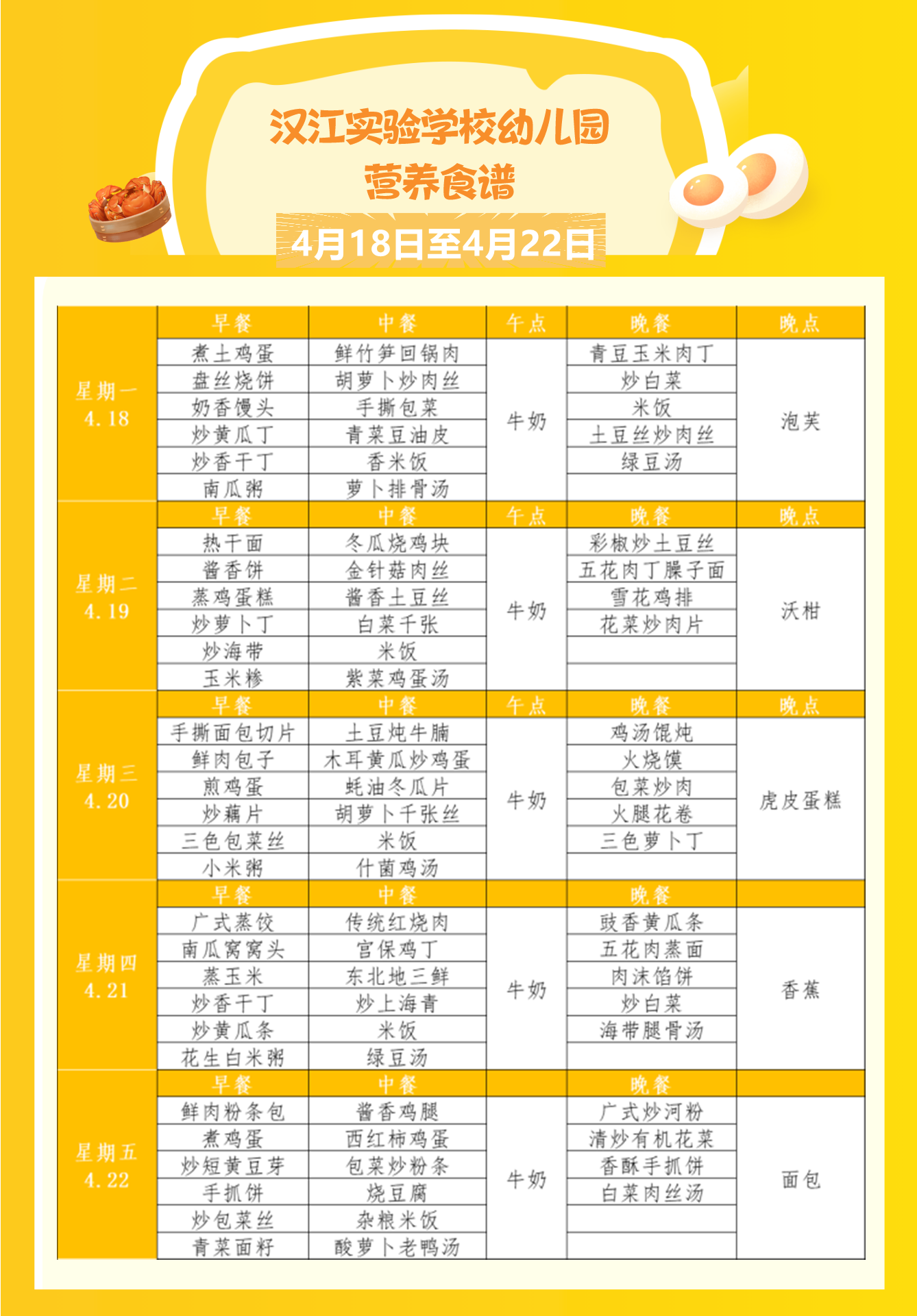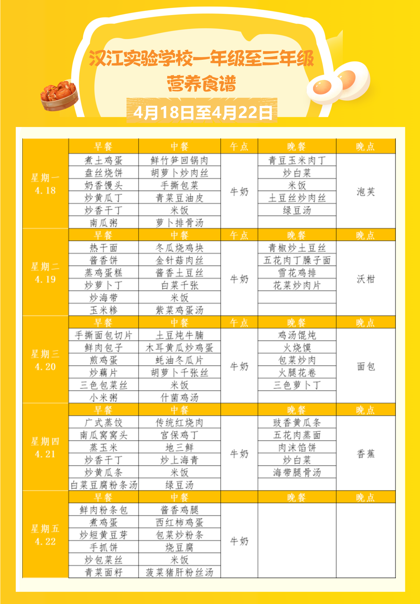 汉江实验学校2022年4月18日-2022年4月23日学生食谱公示