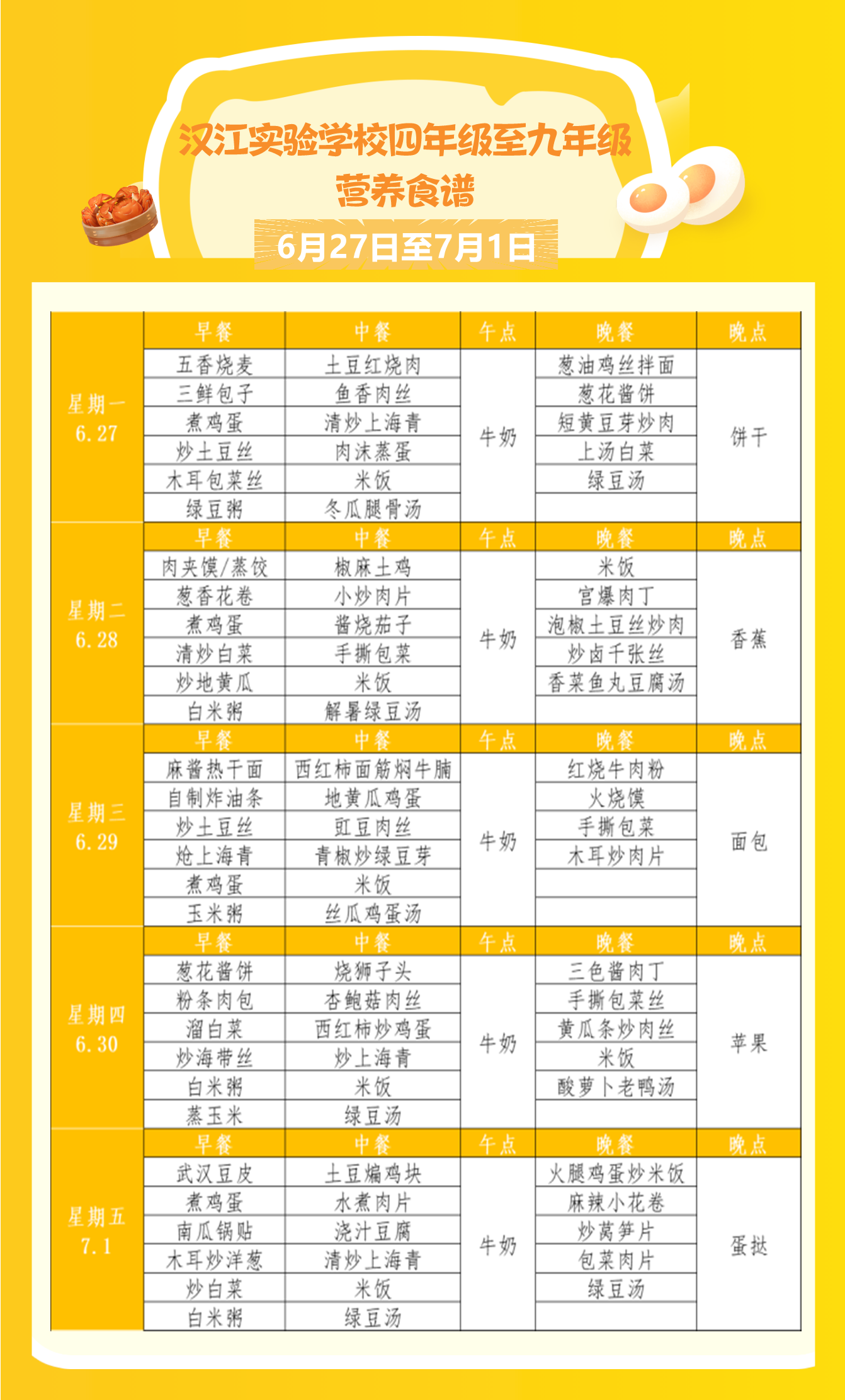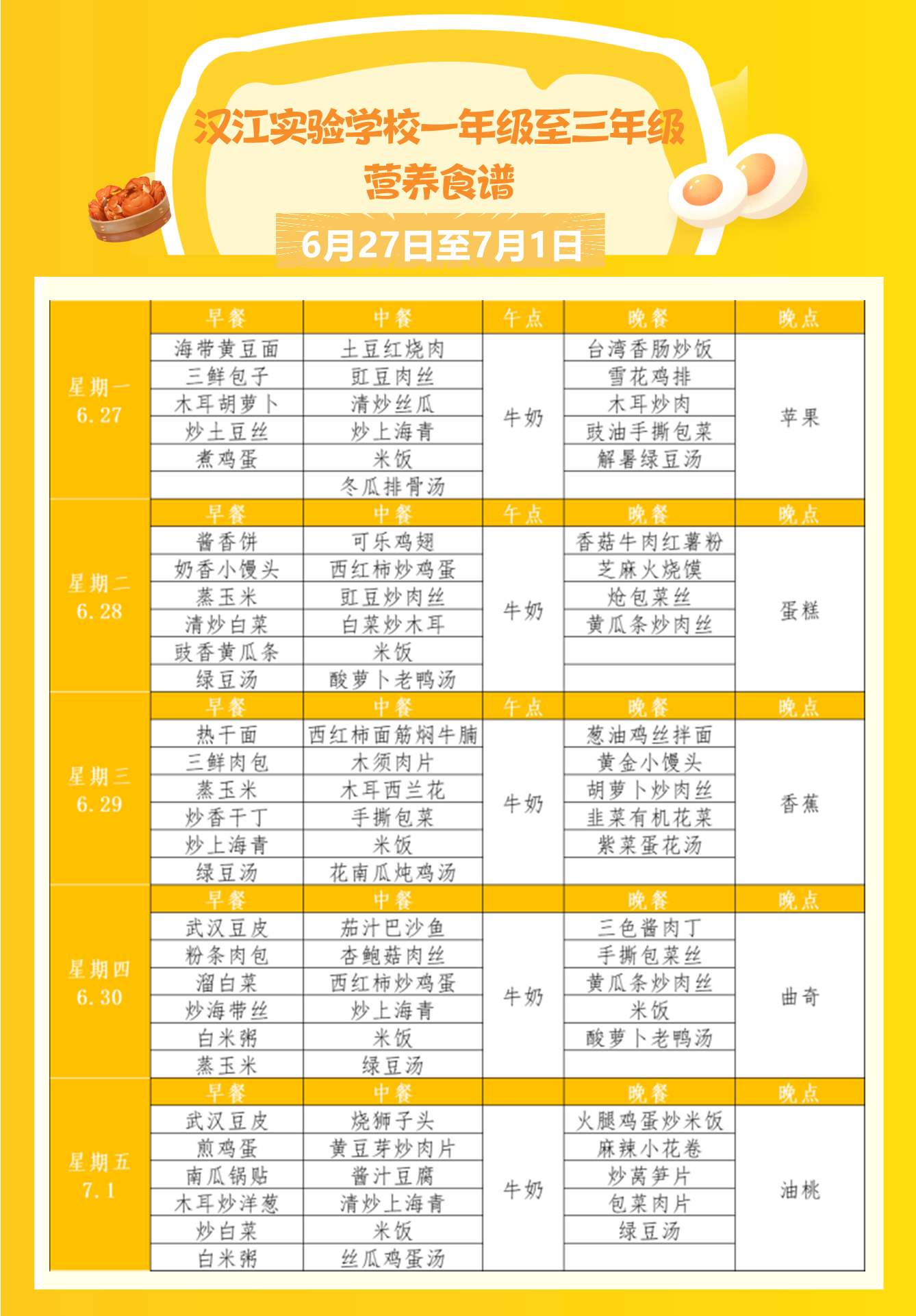 汉江实验学校2022年6月27日-2022年7月1日学生食谱公示