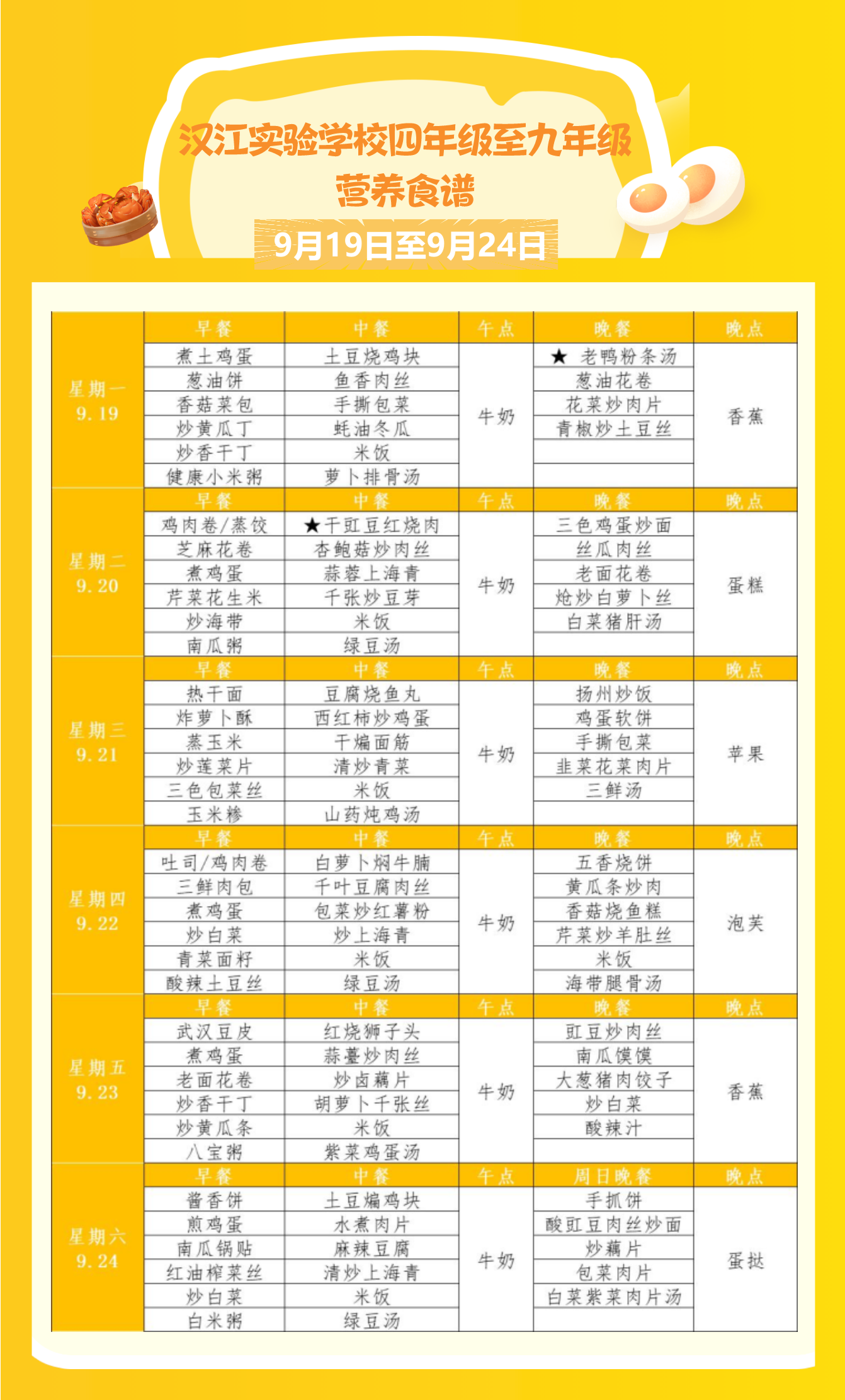 汉江实验学校2022年9月19日-2022年9月24日学生食谱公示