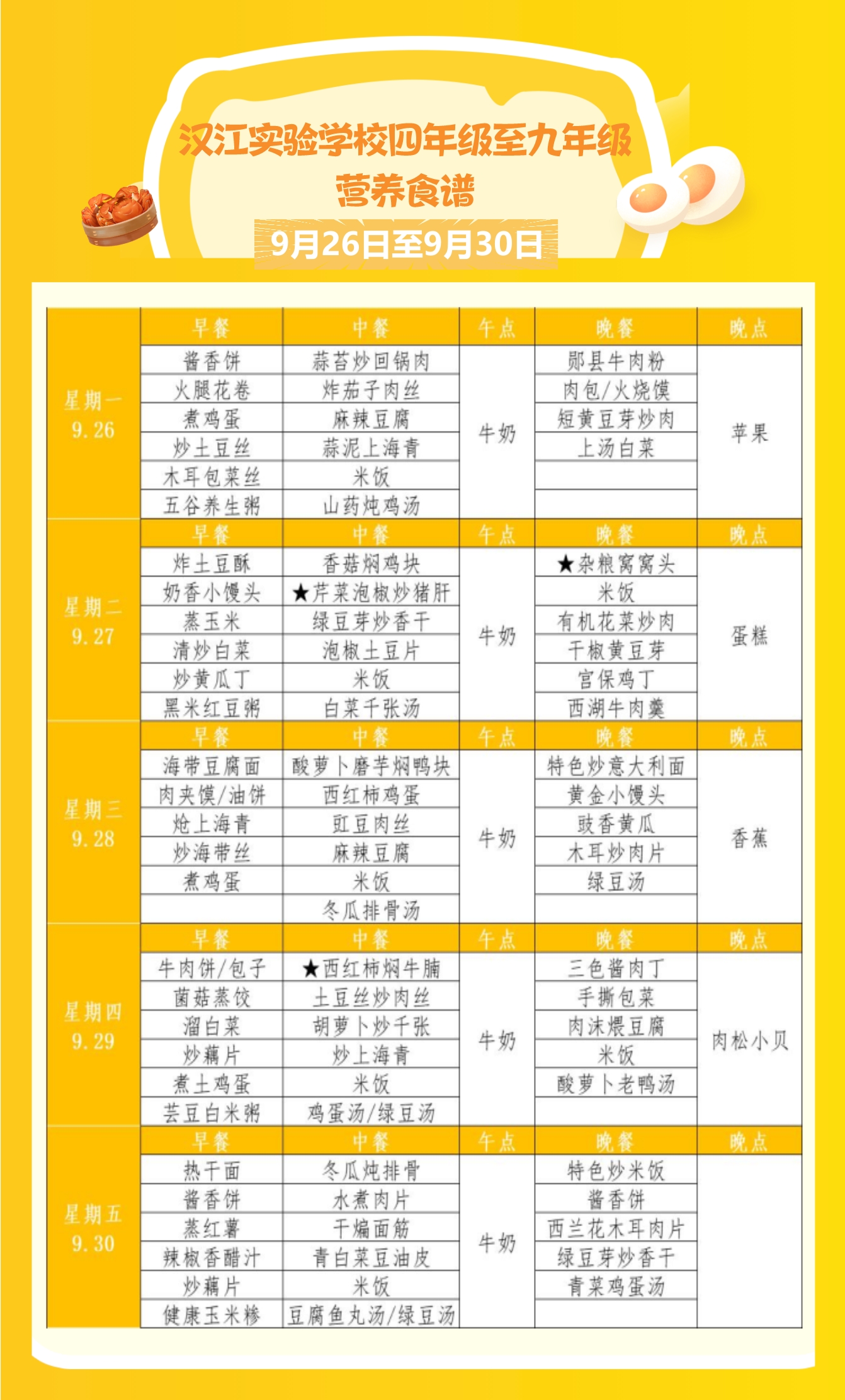 汉江实验学校2022年9月26日-2022年9月30日学生食谱公示