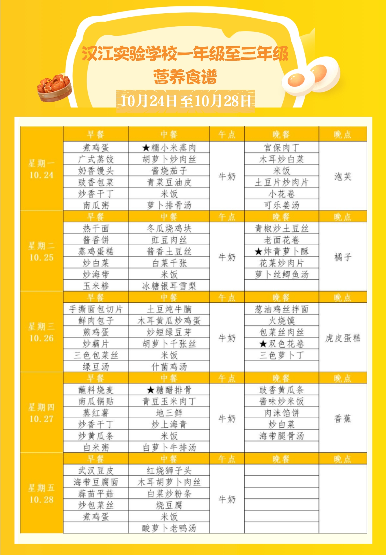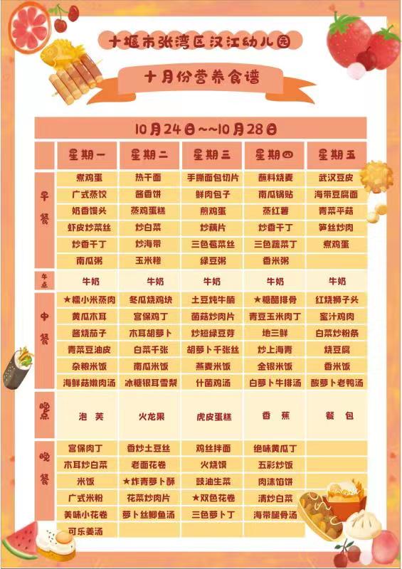 汉江实验学校2022年10月24日-2022年10月29日学生食谱公示