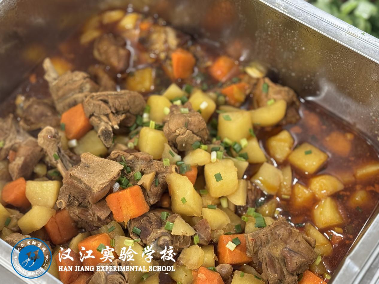 中餐:萝卜焖牛腩、汉江下饭菜、香菇小青菜、木耳大白菜、鱼头豆腐汤、米饭