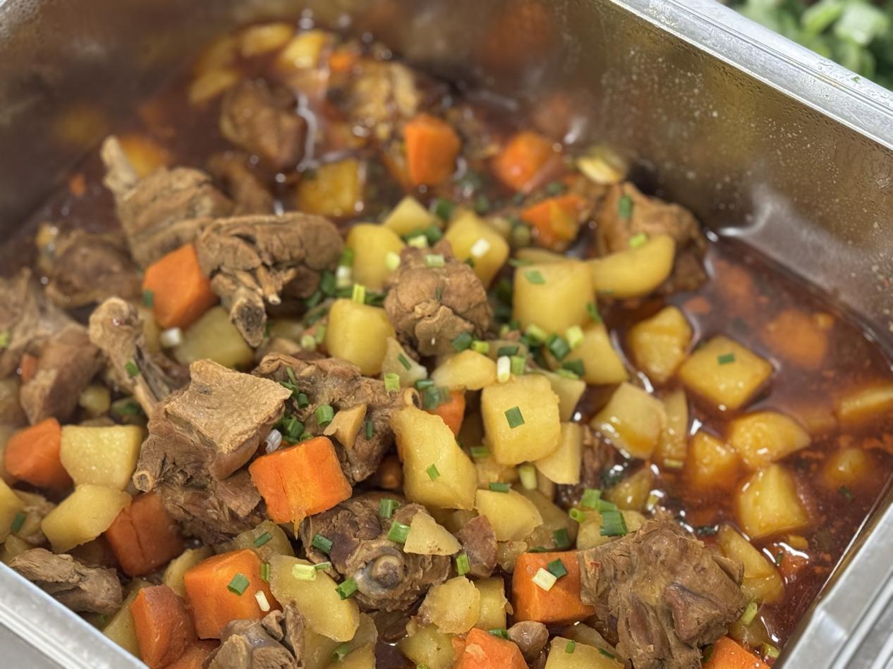 中餐:土豆焖牛腩、孜然肉片、白菜腐竹、青椒炒茄丝、米饭、萝卜牛骨汤