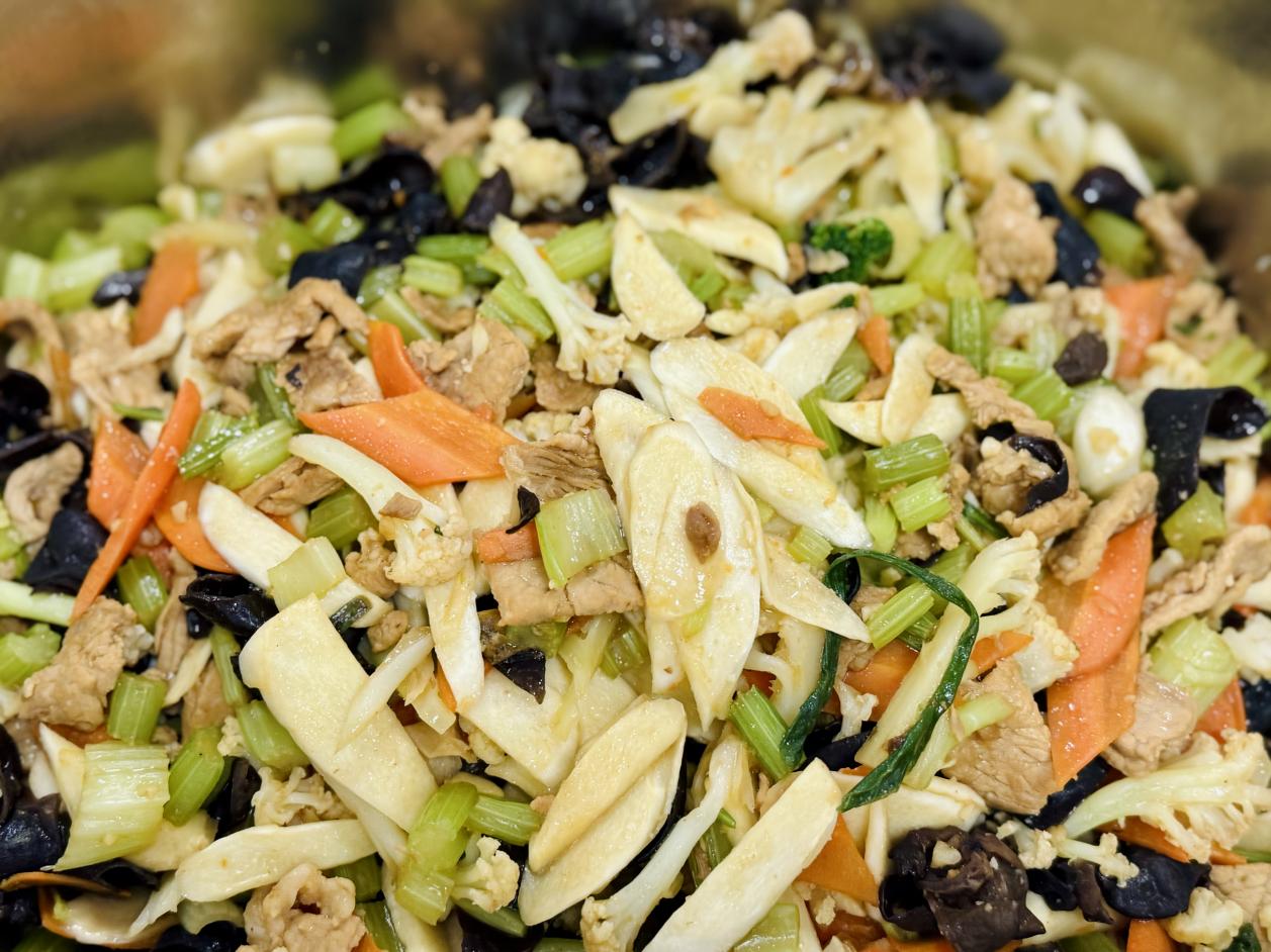 晚餐:广式炒米粉、青椒肉丝、盘丝饼、手撕包菜、银耳雪梨汤