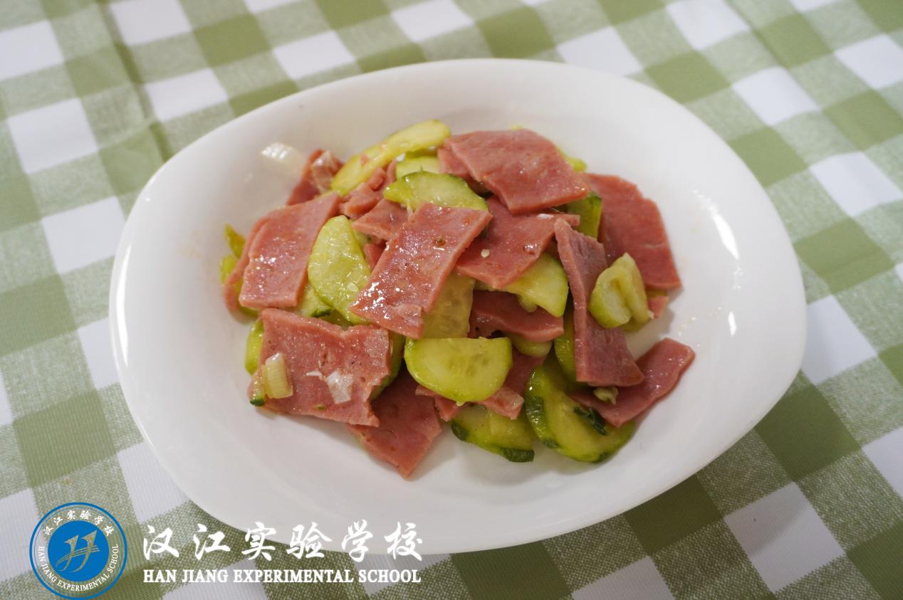 中餐:汉江椒麻鸡、牛皮干肉丝、酸辣包菜、地黄瓜炒培根、冬瓜虾米汤、米饭
