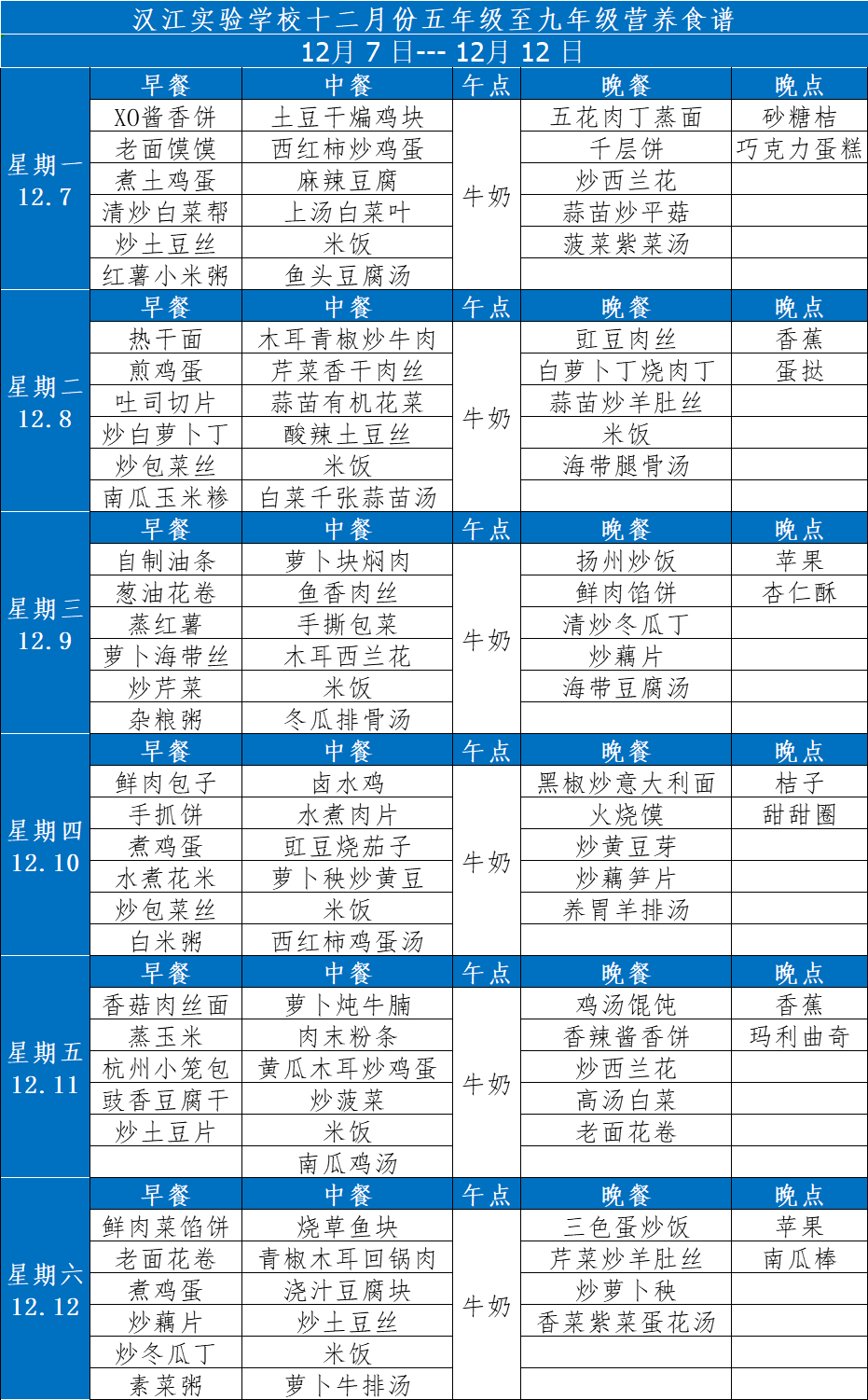 汉江实验学校2020年12月7日-12月12日学生食谱公示