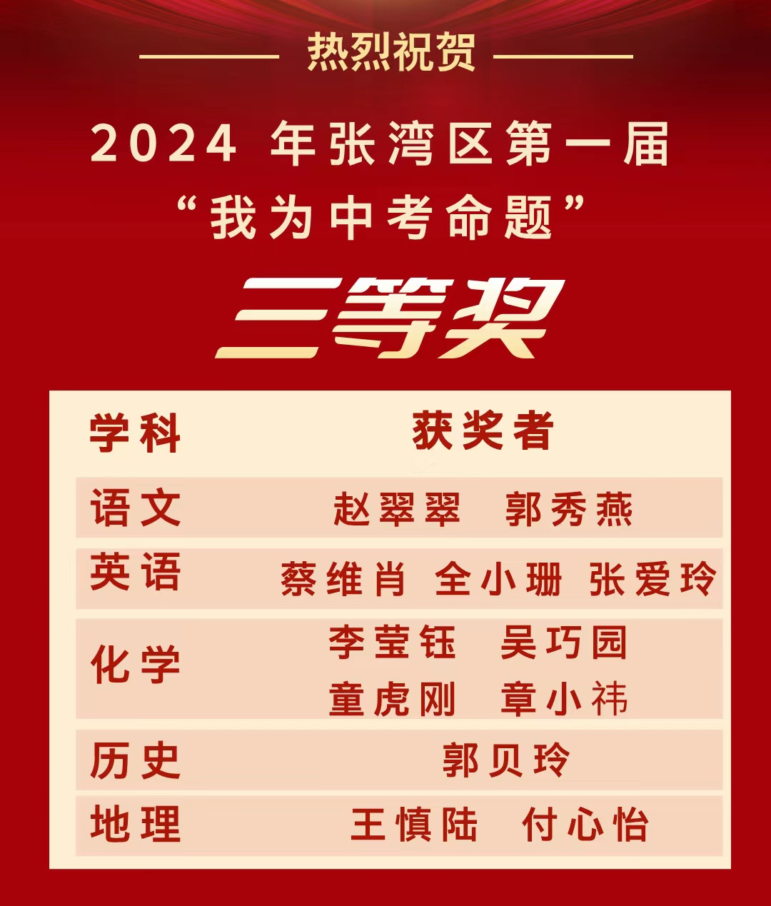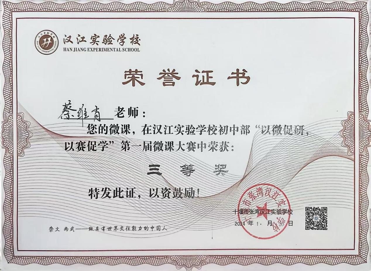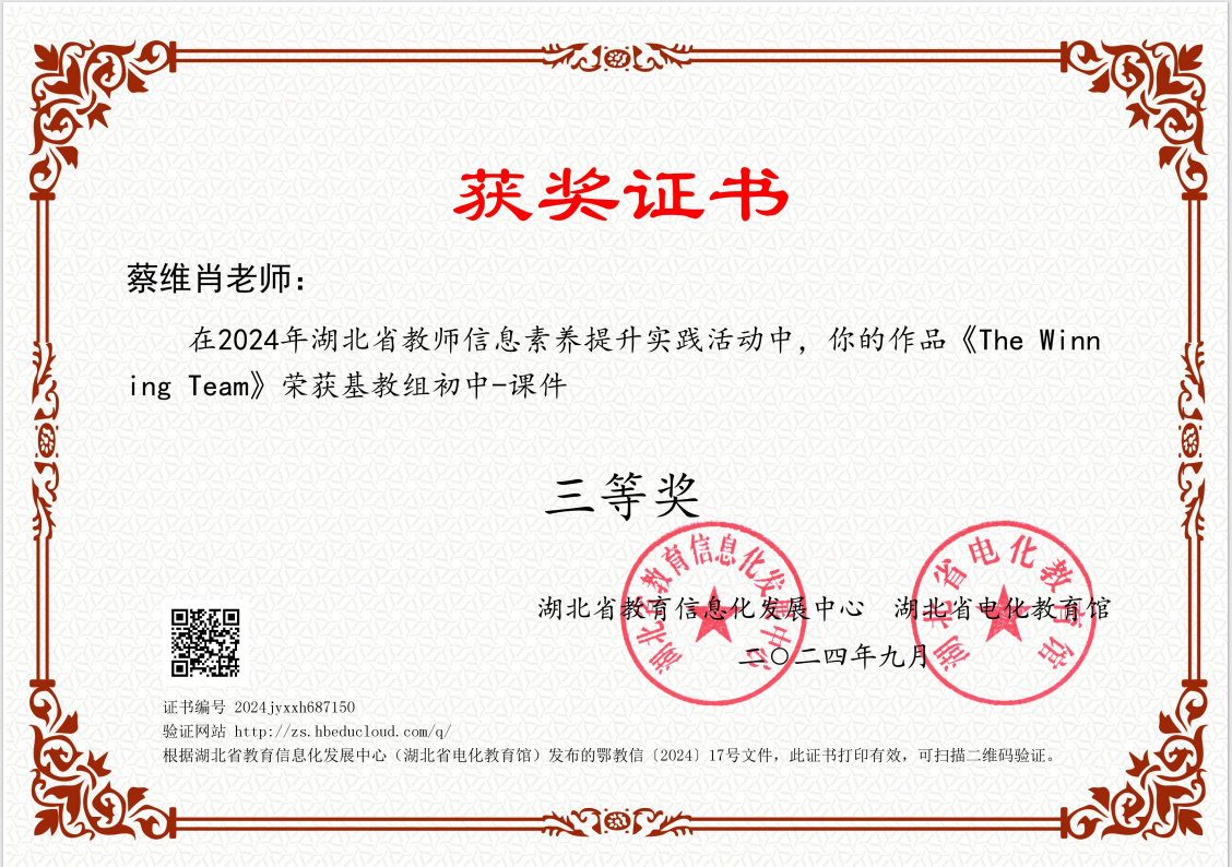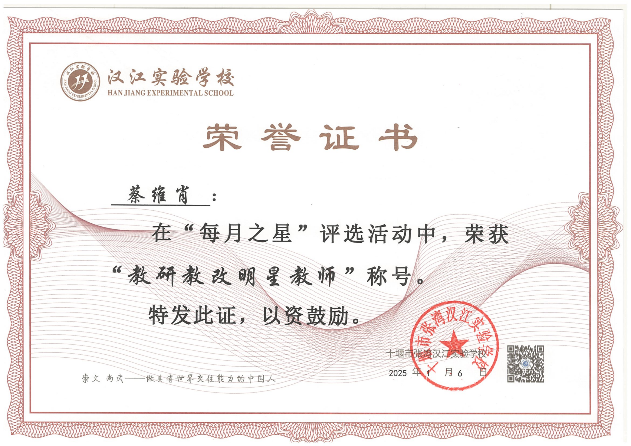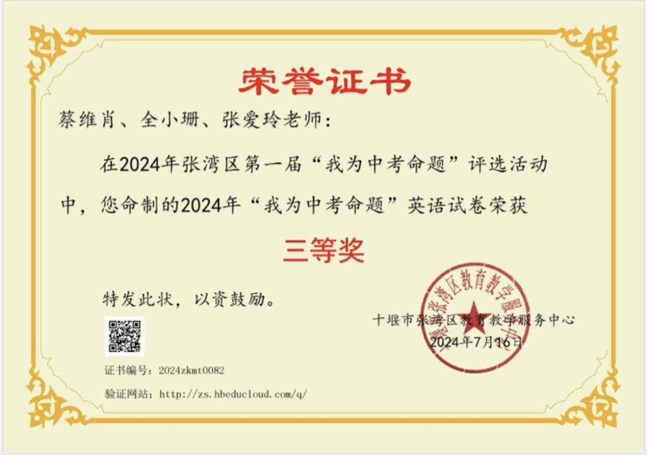 在蔡老师的带领下,七年级英语备课组老师不断丰富自己的教学经验,以饱满的热情和积极的态度参与课题研究和比赛活动,从而进一步提升个人的专业水平。备课组在张湾区第一届“我为中考命题”大赛中分获一等奖和三等奖;在2024年被汉江实验学校授予“优秀备课组”称号。