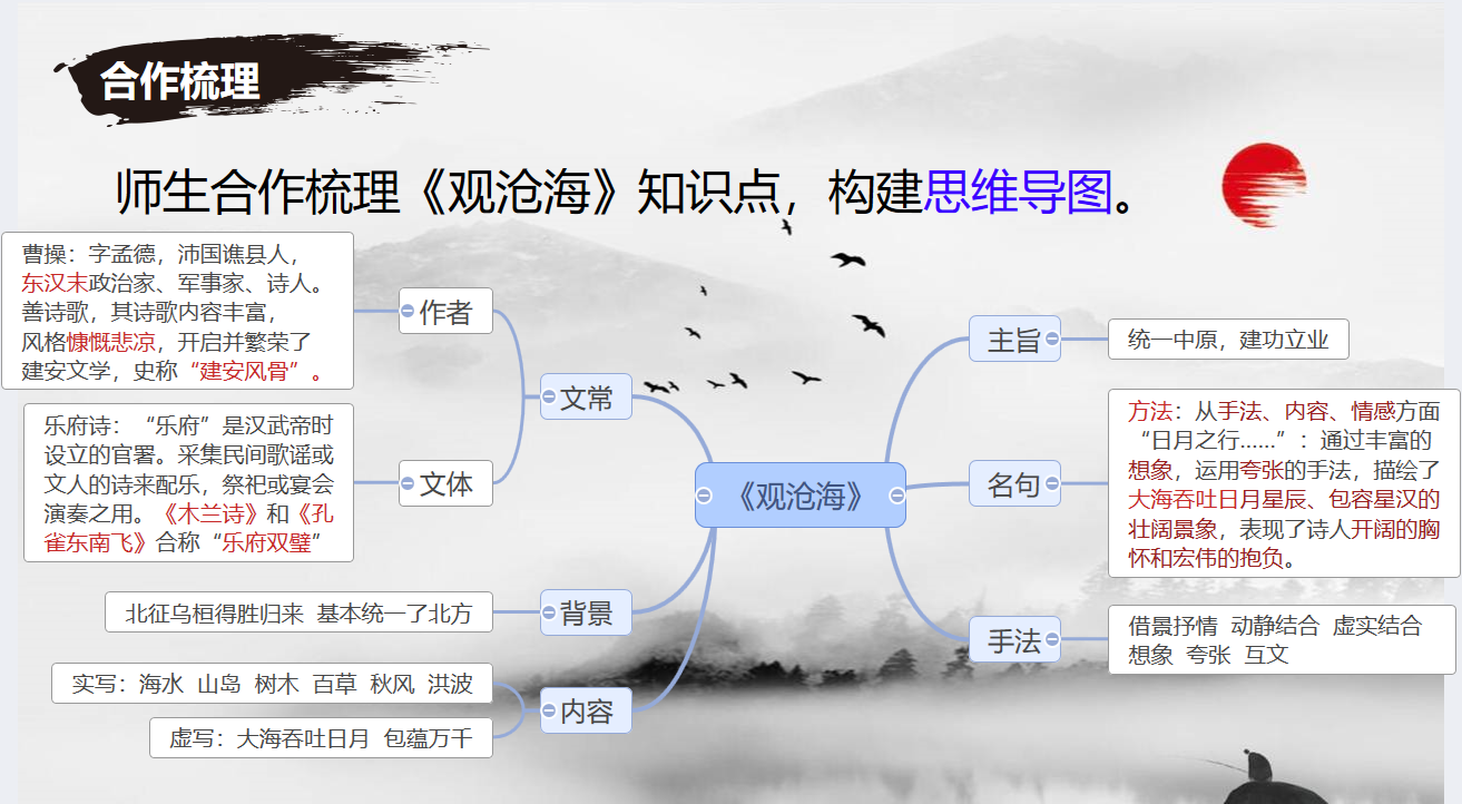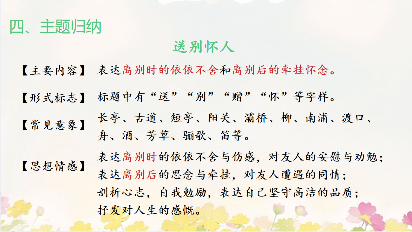 翁老师在教学中始终注重突出学生的主体地位,设计丰富的课堂活动,调动学生积极参与。复习课内古诗词时,她指导学生绘制思维导图,从文常、背景、内容、主题、名句、手法等方面梳理诗歌知识点,构建知识体系,并将这种复习思路延伸到文言文、现代文的复习中,同学们积极尝试,小组交流,共同进步。在九年级中考总复习时,翁老师进一步指导学生根据主要意象分类展开主题组诗复习,以“送别怀人”主题为例,指导学生从主要内容、形式标志、常见意象、思想情感方面归纳整理,总结出“找意象—析特点—明作用”的答题思路,从课内古诗走向课外古诗,有效地提高了学生理解课外古诗词的能力。