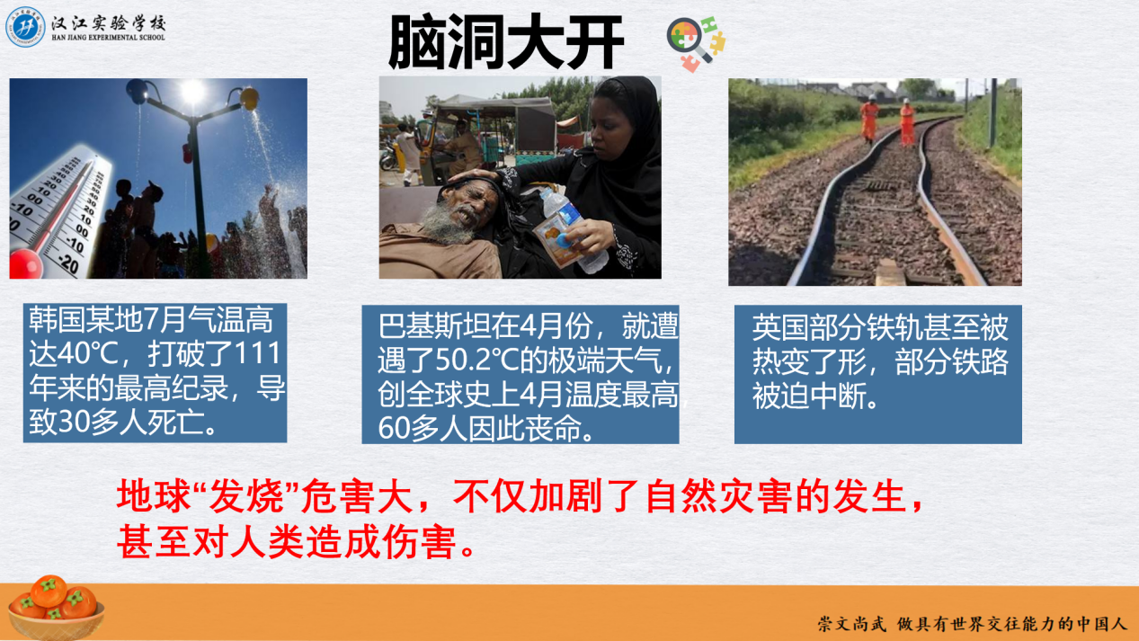 教学过程中,我们以阅读时政热点新闻、案例分析、小组讨论等方式,融入“脑洞大开”“社会观察员”“保护地球我倡议”等活动,让学生深入了解地球“发烧”的原因及后果,塑造学生的道德责任感和法治观念。