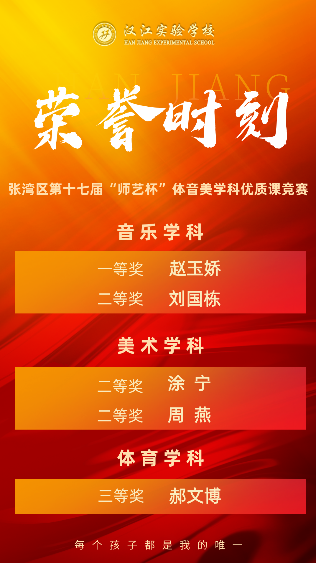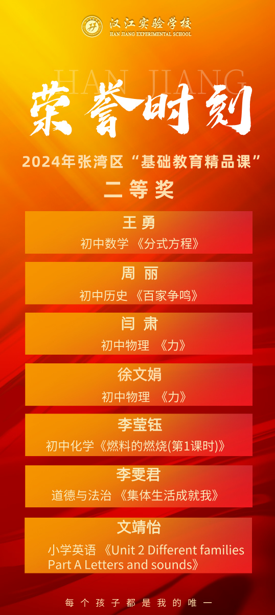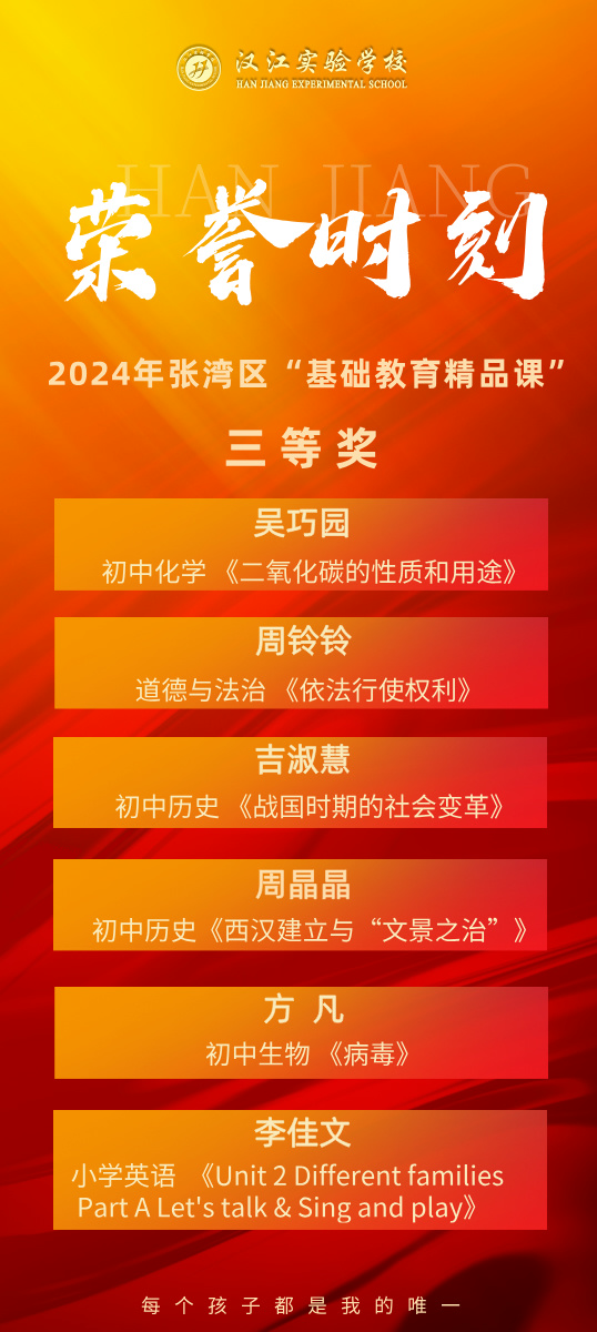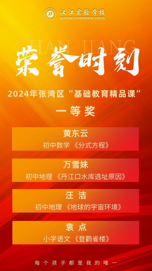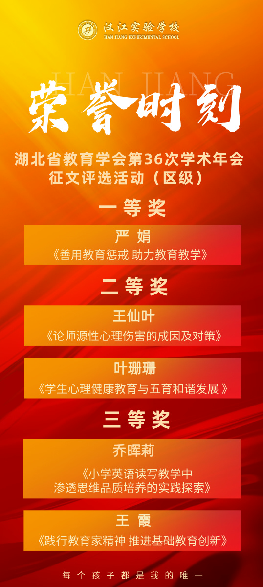 一项项荣誉,是汉实奋进征程中的一颗颗璀璨之星,是汉实人在勇于进取中探索创新,在持续努力中寻求突破,在不懈奋斗中收获成绩,照亮前行之路。一份荣誉,一份责任。汉江实验学校会继续重视教师队伍建设,鼓励教师积极参加各级各类竞赛,提升教师专业素养,砥砺前行,以实干的精神、拼搏的激情、进取的斗志创造更加骄人的成绩。