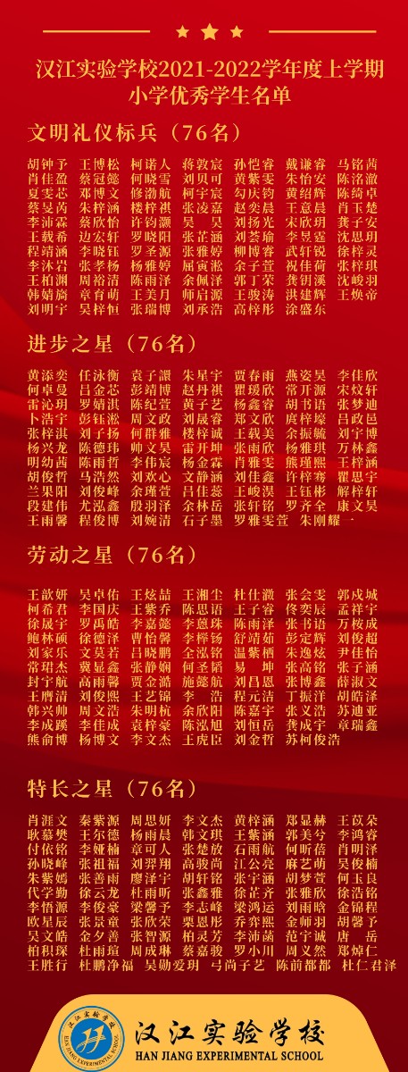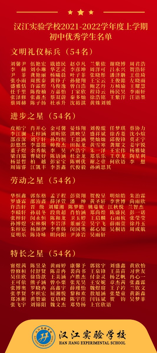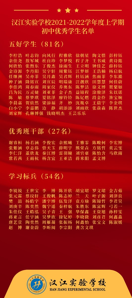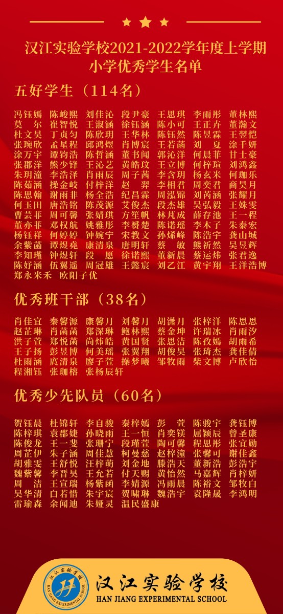 汉江实验学校2021-2022学年上学期“优秀学生”表彰名单