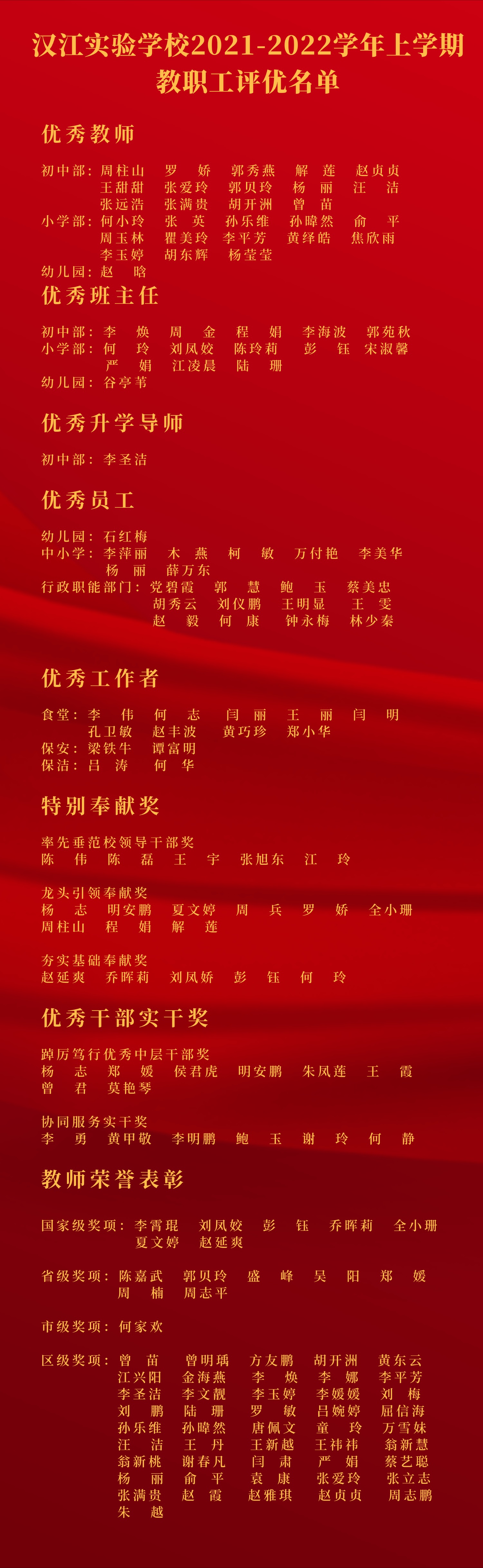 汉江实验学校2021-2022学年上学期教职工评优名单
