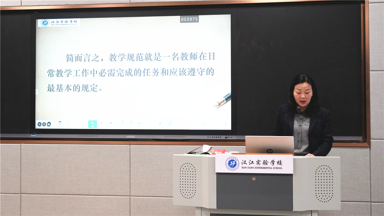 教导处主任助理朱凤莲作了“规范教学行为 提高教学质量”主题报告,分享了自己高效开展计划、备课、上课、作业、听课、总结等11项教学常规工作的实操经验和具体方法,倡导教师们对教学工作要心怀“敬畏”,做到“心中有规则、做事讲规则、行为守规则”,为青年教师成长为一个业务专精、心态端正的优秀教师提供了丰富的“养料”。