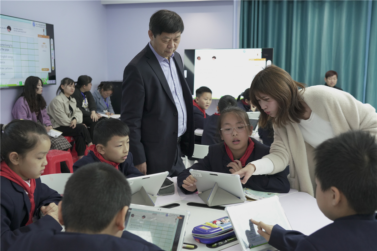 省民协一行参观了我校教学楼、学生宿舍、特色功能室等场所,在未来教室观摩了初中七年级数学和小学五年级英语智慧课堂。