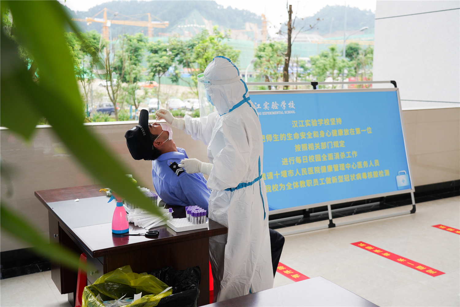 为落实十堰市新冠肺炎疫情防控指挥部《关于切实做好全市各级各类学校2020-2021学年秋季开学工作的通知》(十肺炎防指〔2020〕99号)“教职员工核酸检测全覆盖”要求,我校于8月22日下午,邀请十堰市人民医院健康管理中心医务人员进校,对全体教职员工进行了新型冠状病毒核酸检测。