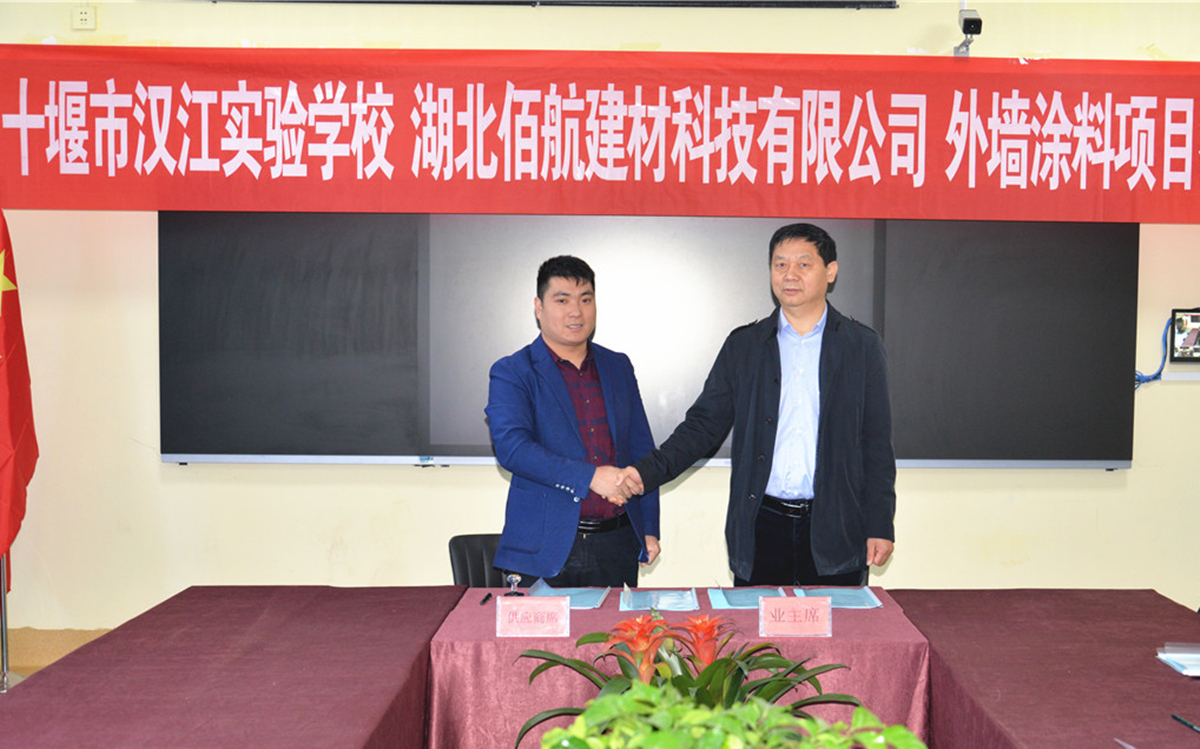 湖北佰航建材科技有限公司董事长高建强、我校校长朱仕竹、副校长陈伟、李勇等领导出席了签约仪式。高建强董事长与朱仕竹校长分别代表双方签署了外墙涂料项目施工合同。