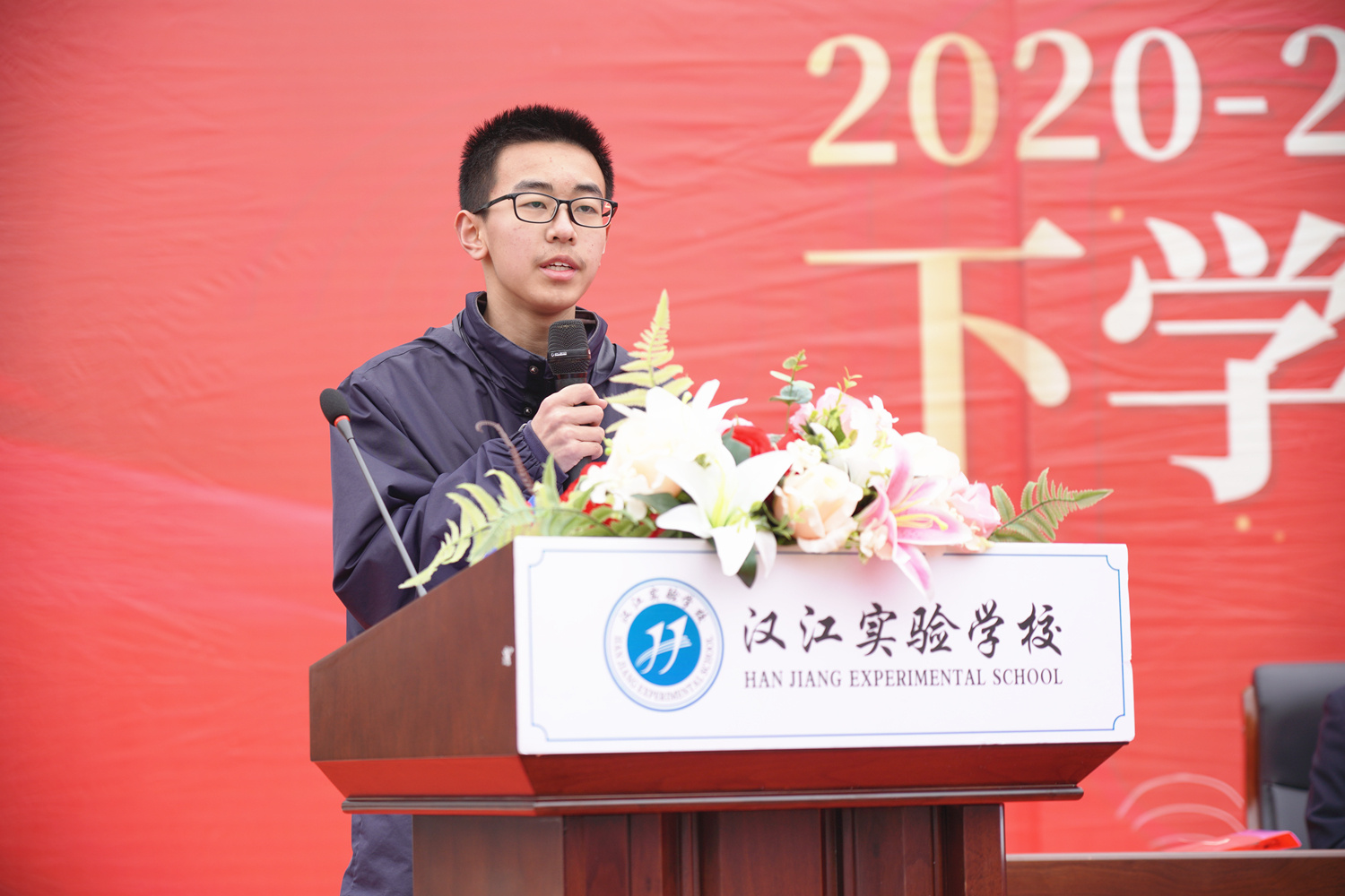 九年级二班学生王晋安作为优秀学生代表做了《拼搏奋斗逐梦前行,不负春晖“犇”向未来》的发言。他带着对中考的信心与期待,呼吁全体同学们要珍惜时间、摆正心态、端正学习态度、调整学习方法,在学习上不畏困难,在生活上互帮互助;以梦为翼,不负韶华,做“今天我以汉江实验学校为荣,明天汉江实验学校以我为荣”的优秀学子。