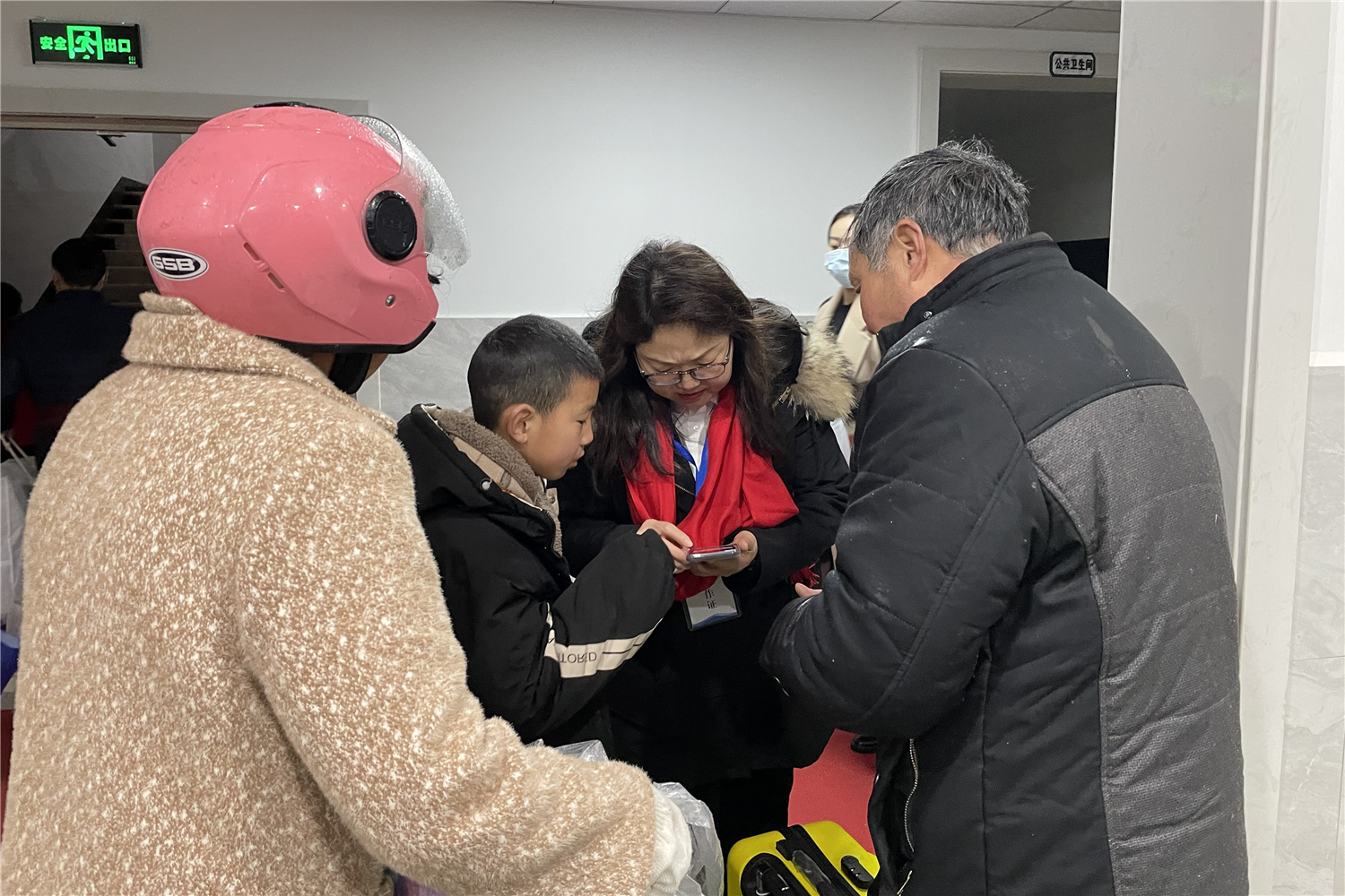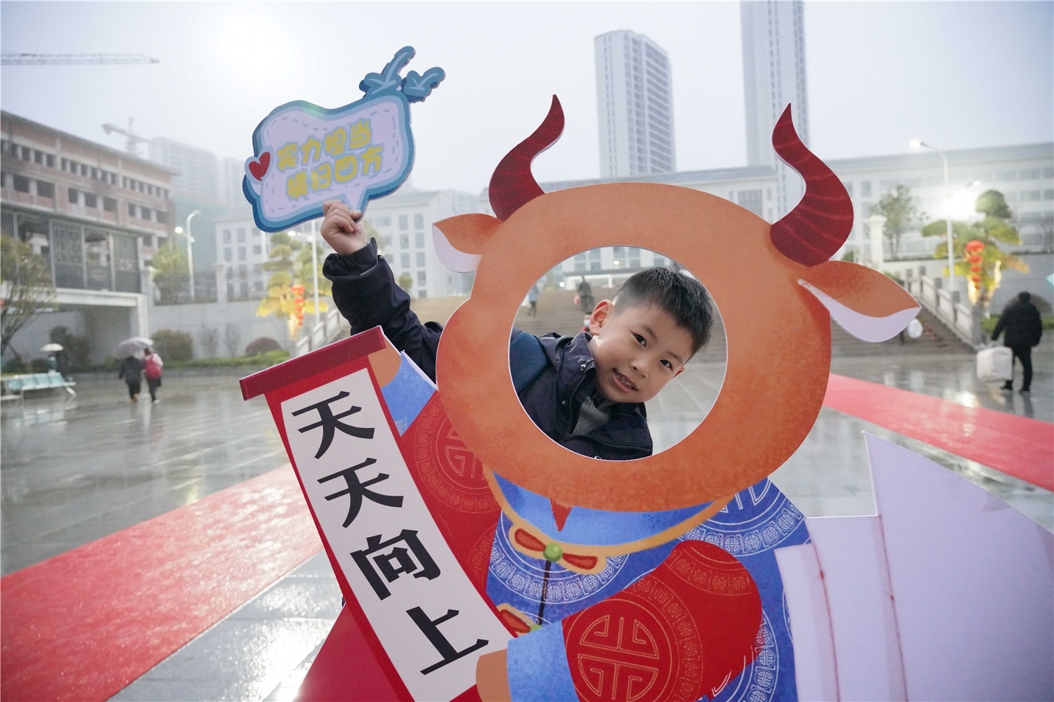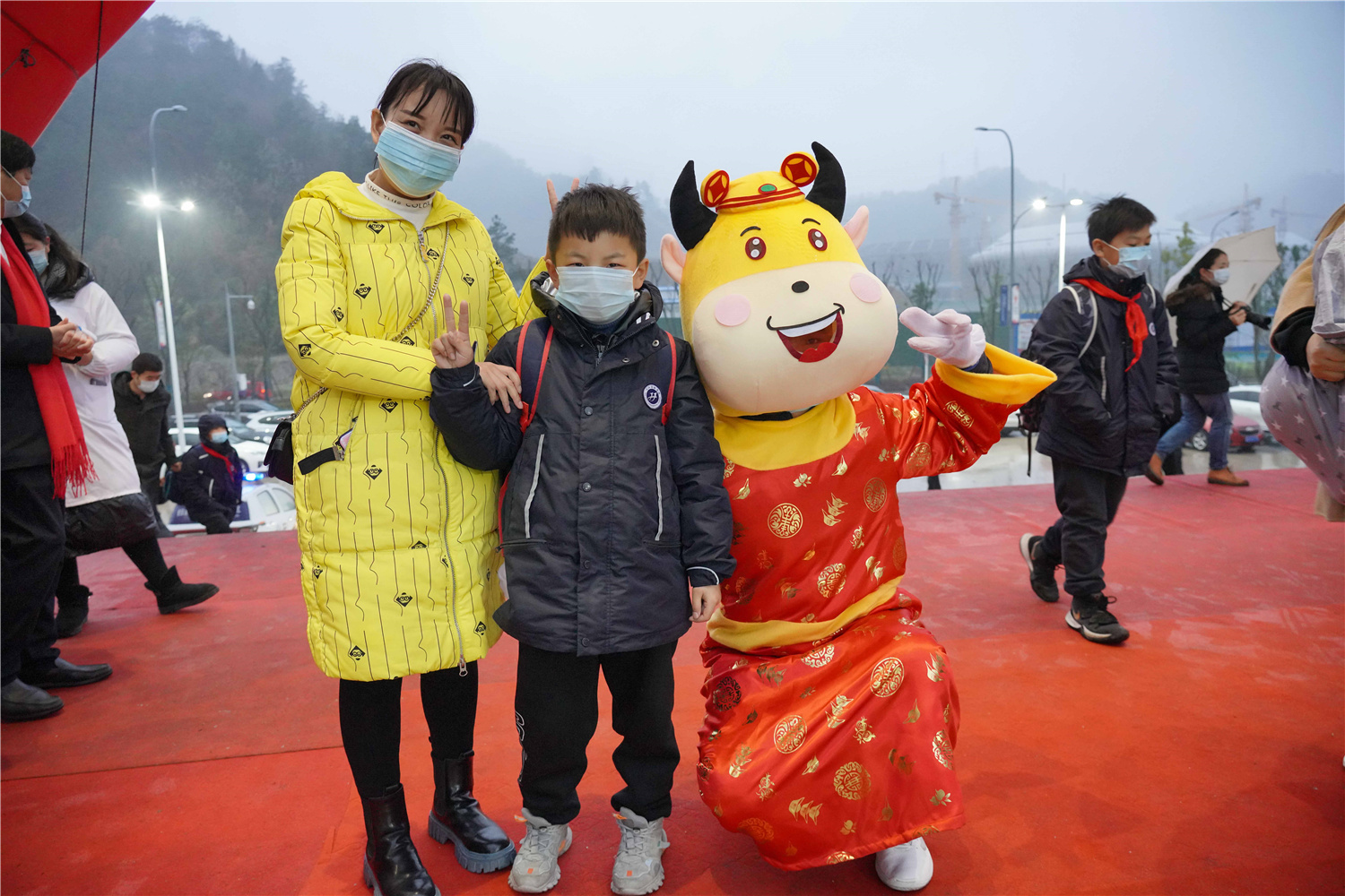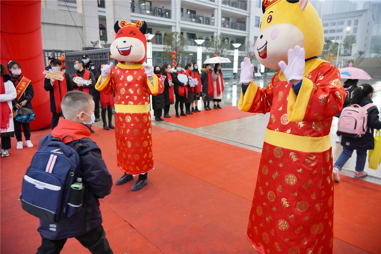 校门口,开学气氛热烈,“吉祥牛”、红地毯、大型拱门、“牛年特写”照相框,手举励志标语牌的校领导和老师、同学们,让家长和孩子们倍感亲切、温暖、祥和。校前广场,孩子们兴奋地与“吉祥牛”来一个“爱的抱抱”,在“好好学习,天天向上”的“牛年特写”照相框与父母来一张合影,留下成长路上的精彩瞬间。在教职员工的引导下,家长和孩子们一起走过红地毯,《少年》、《我相信》等歌曲欢快、悦耳,给孩子们创造一个快乐的校园,一个不一样的开学。由教职员工组成的“温暖之手”团队,引路、扛行李、耐心解答,给学生和家长提供最细致的服务。