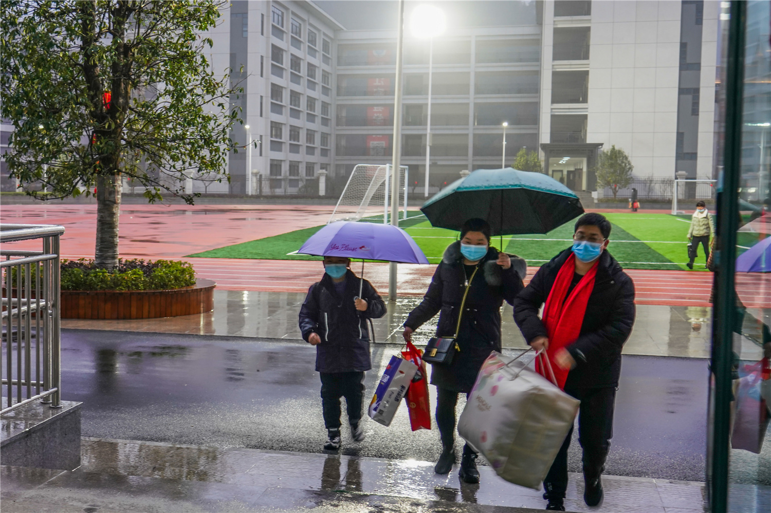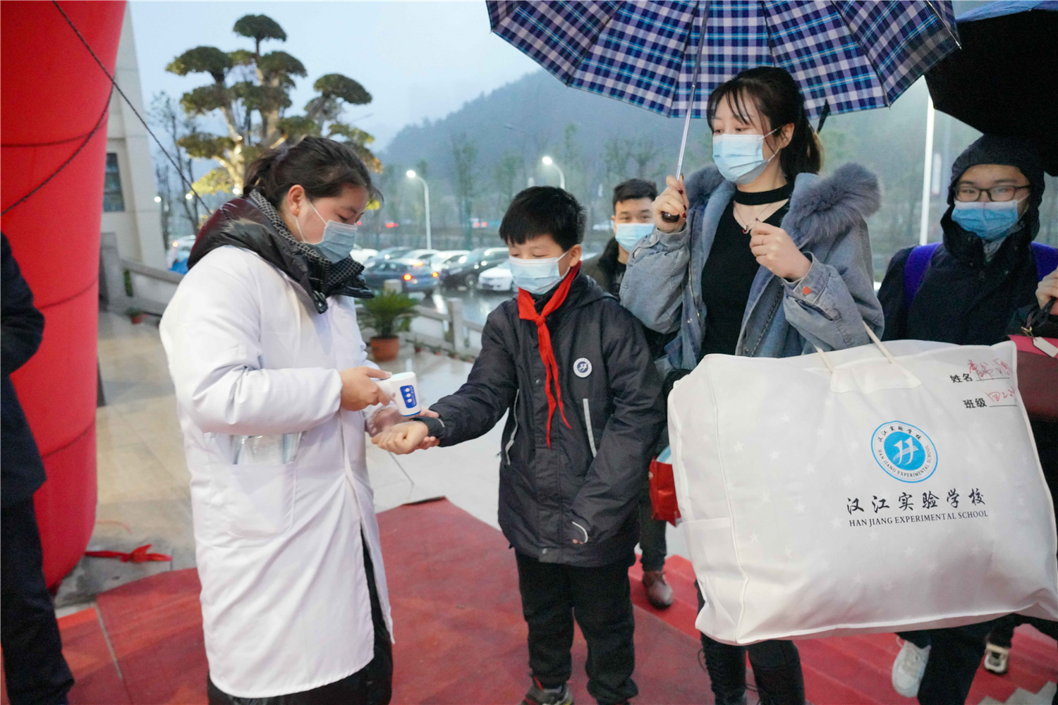 假期的欢乐余韵未尽,全新的号角已然吹响。2021年2月27日至28日,汉江实验学校小学部和初中部的孩子们,伴随着欢快的新春脚步,和着轻快的音乐旋律,满载着父母的殷切期望,怀揣着自己的远大理想,满怀信心的返校啦!细雨蒙蒙的清晨,校领导及教职员工统一着盛装、系红围巾,早早站在校门口迎接同学们。