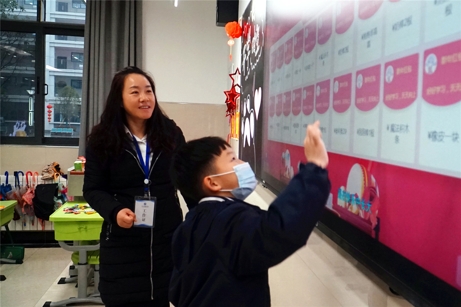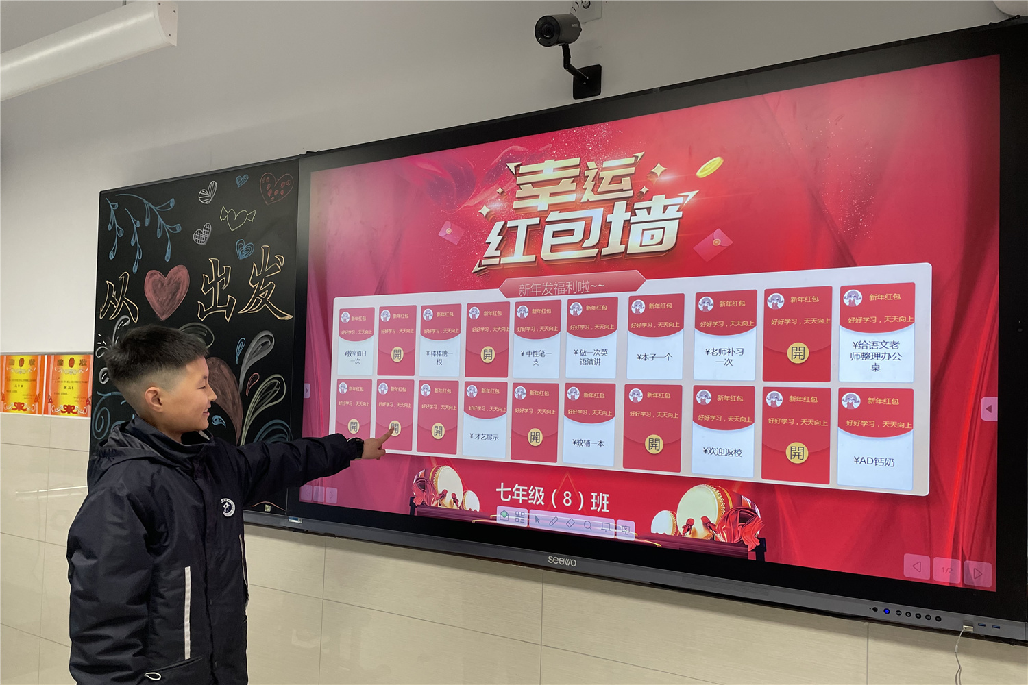 教室里,老师们利用希沃智慧黑板制作了新学期祝福抽奖活动,每个孩子可像抽取“盲盒”一样,领取属于自己的神秘奖励。“免责劵一张”、“免数学周末作业一次”、“给老师整理办公桌”等开学红包,让孩子们感到既新奇又充满乐趣,家长们纷纷点赞老师们的创意和用心。校长朱仕竹,副校长陈磊、王宇、陈伟、张旭东等领导也来到小学、初中各班级,为孩子们送来温暖的问候。