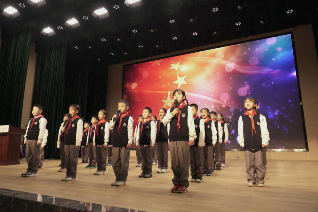 小学举行纪念一二·九活动,全体学生手持学生平板,齐诵《少年中国说》。