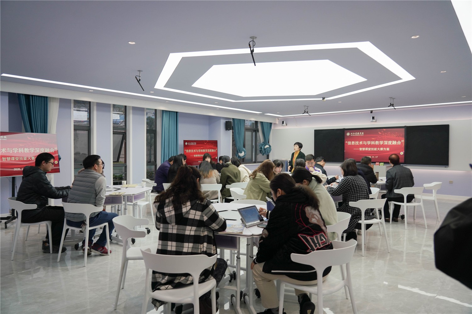 我校举行了“信息技术与学科教学深度融合”智慧课堂技能大赛。本次比赛分希沃白板5功能展示、希沃易课堂实际应用、现场说课三个环节。