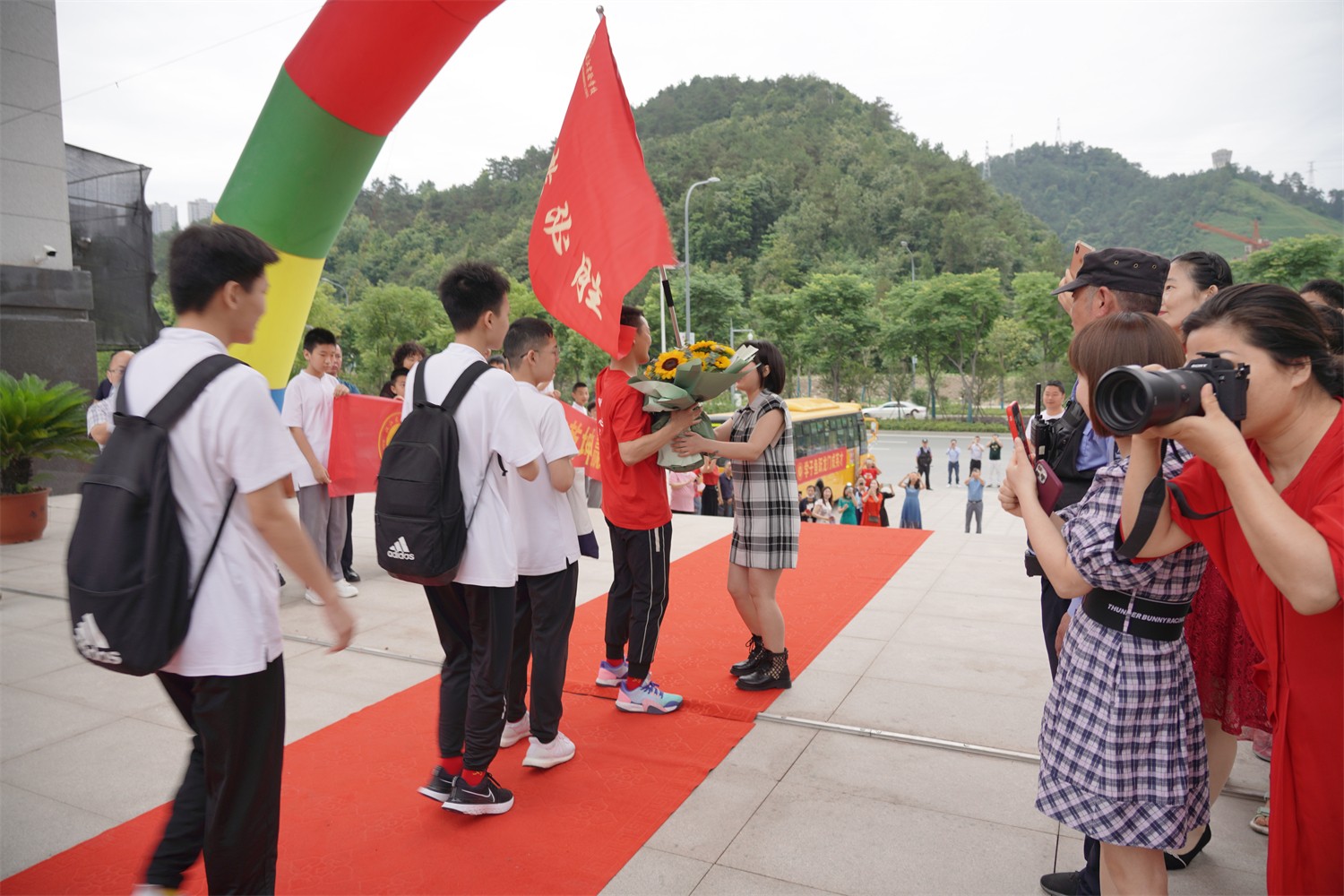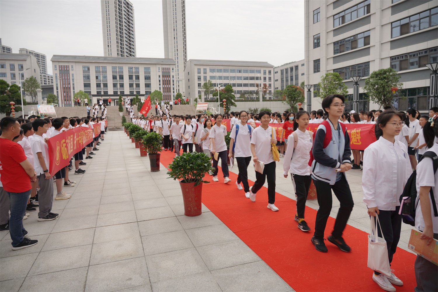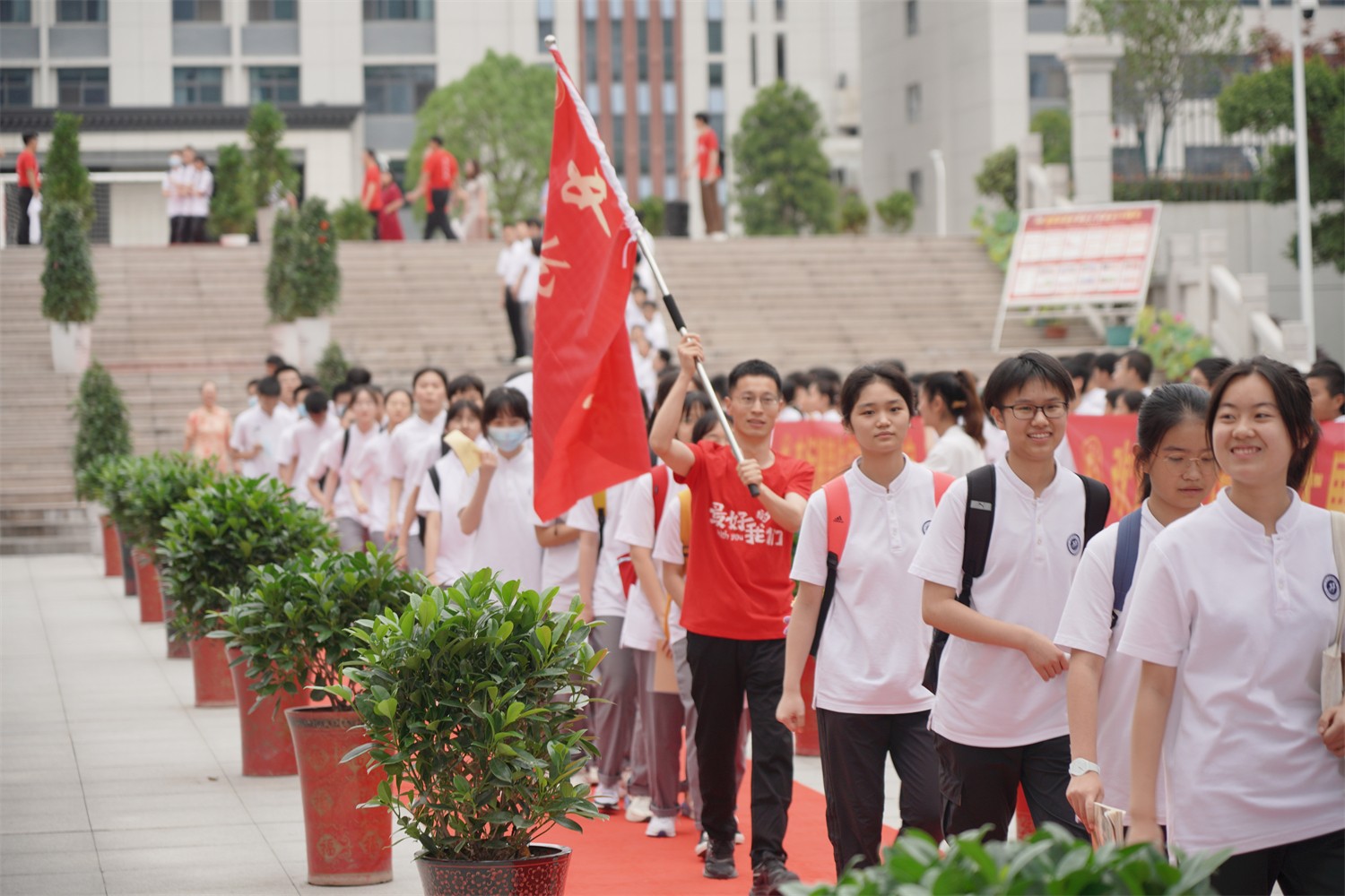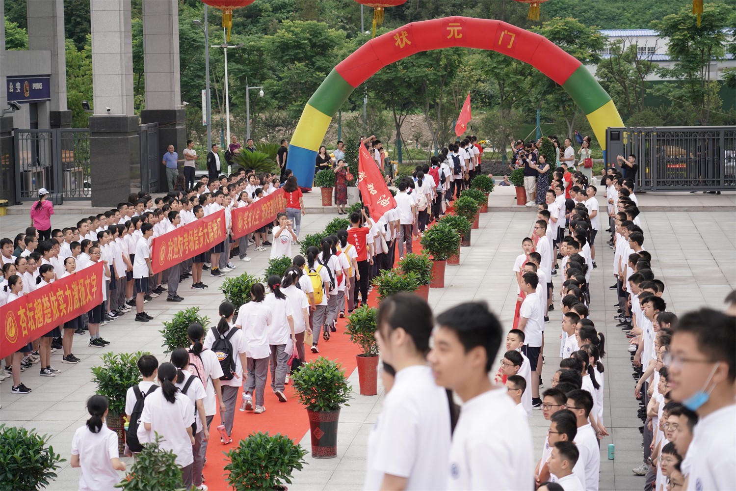 “勇士不怕征战难,书山题海只等闲。”考生个个步履铿锵、目光坚毅,与老师及学校领导热情互动,踏上象征着成功与希望的红地毯,面带微笑、意气风发的依次穿过寓意一举夺魁的“状元门”,朝着梦想奔赴前行!七八年级学弟学妹们组成的送考队伍,手执送考横幅与科任老师整齐排队,他们用热情的欢呼、激昂的口号为初三学子加油助威。