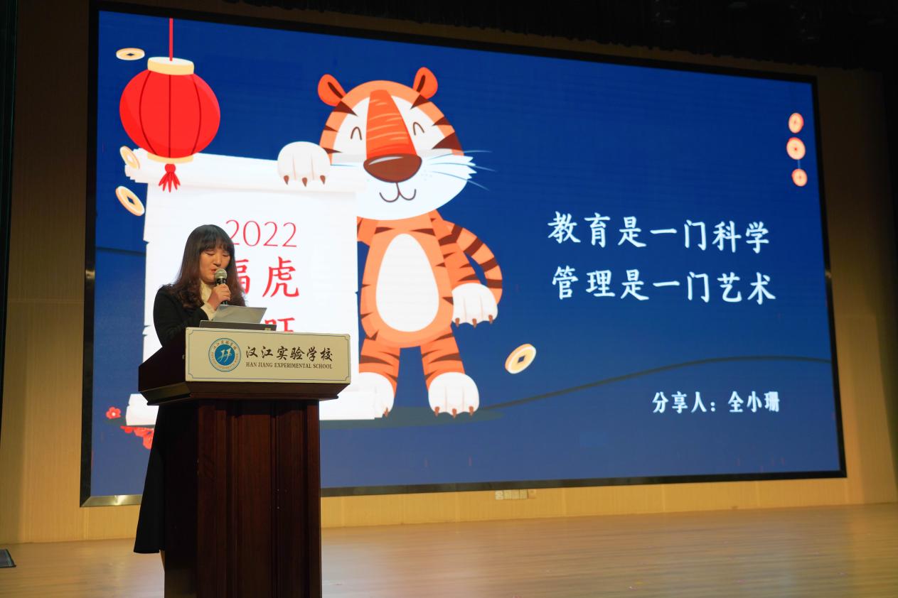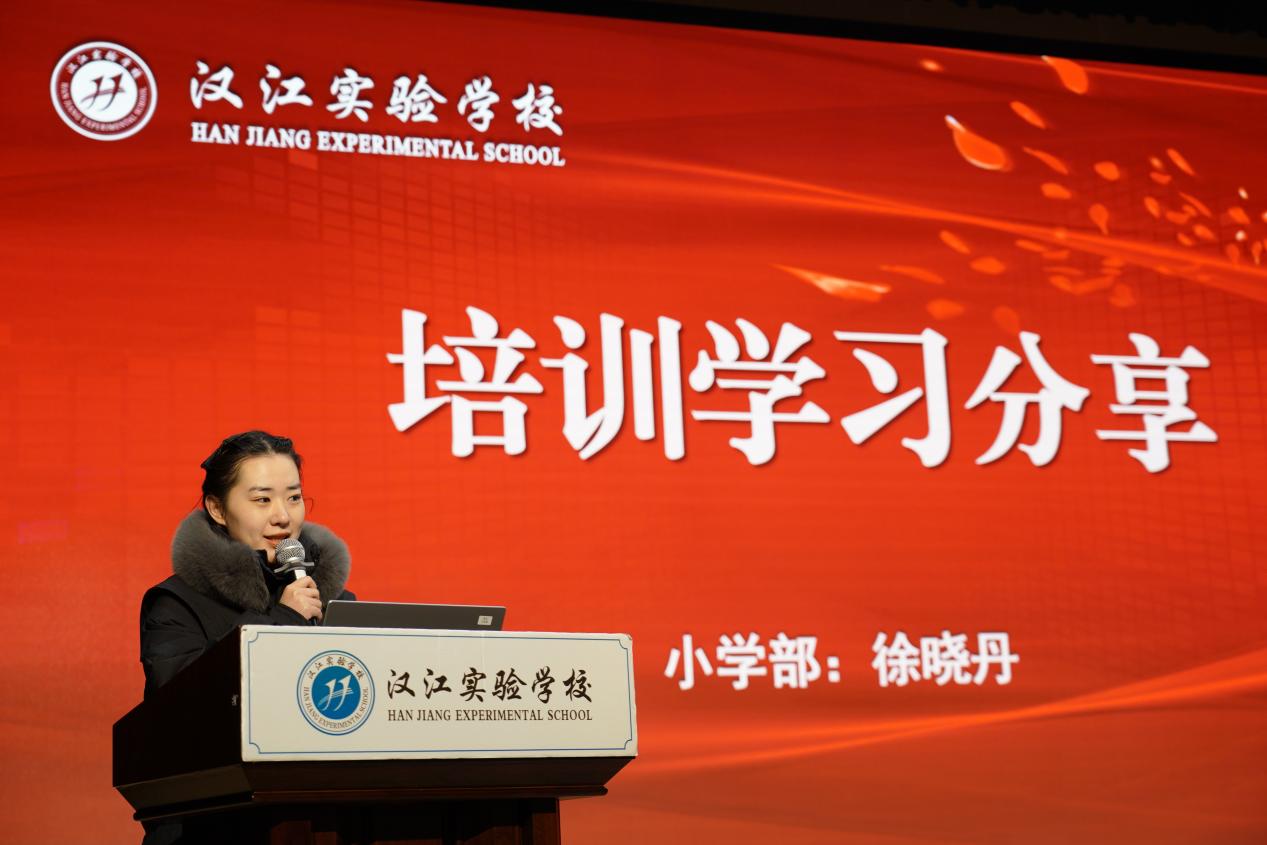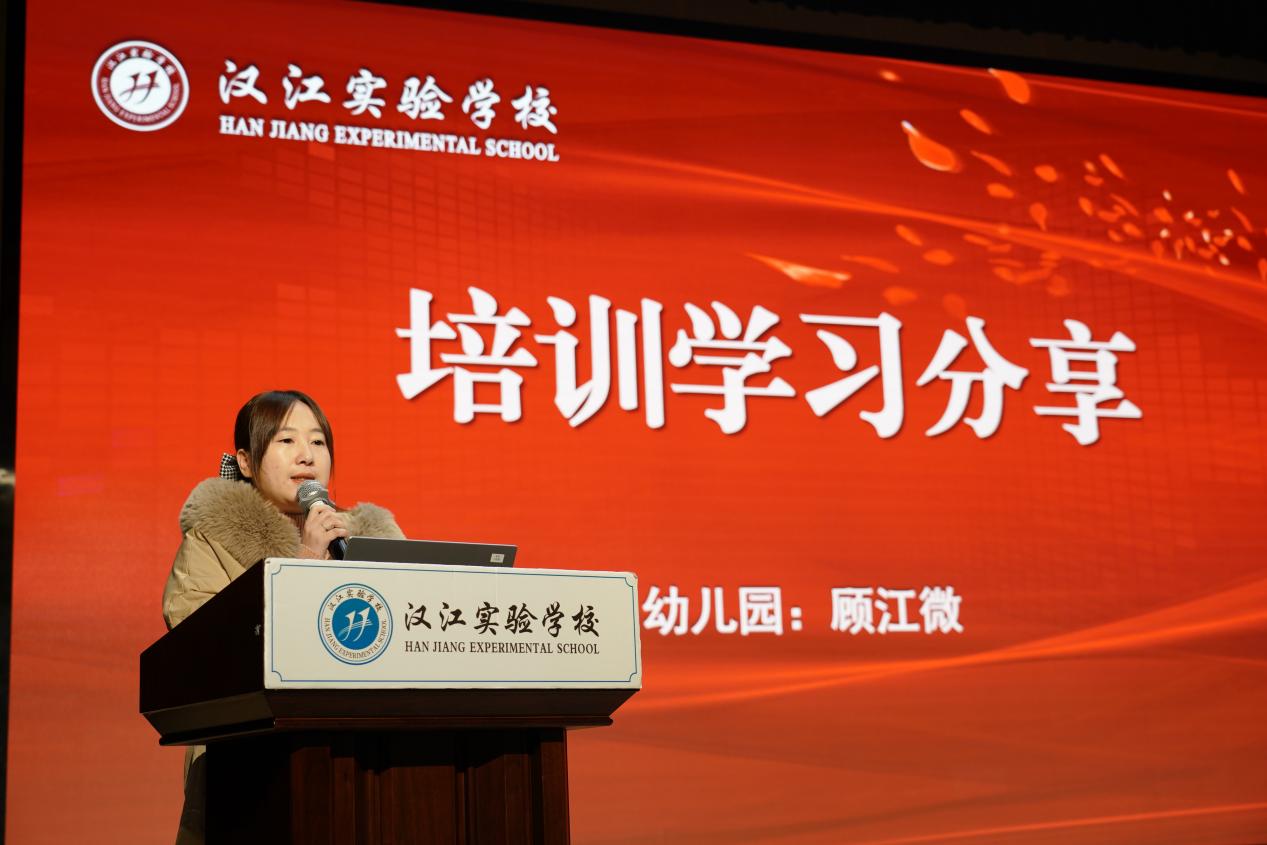 培训结束后,各学部优秀教师代表分别上台分享了自己的学习收获。幼儿园教师顾江微用“幸福、收获、提升”三个关键词总结她的学习体会,就幼儿园日常的工作谈及自己的教学心得,希望自己和汉实大家庭一起争做善于发现、勤于学习、精于练笔的智慧型教师。小学语文教师徐晓丹回忆起她在汉实学习成长的点滴,从“青蓝工程”的帮扶到日常的讲课、评课、磨课,她脚踏实地的积累,勤勉刻苦的钻研,收获了属于自己的教师职业幸福感。初中部英语教师李娜分享了自己参与培训的所想所思,她提到要热爱教师工作,拥有职业认同感和归属感,树立终身学习的教学理念,最终必然会将这份工作尽善尽美。