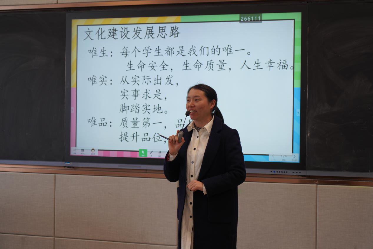校长朱仕竹作《勠力同心,笃行不怠,做汉实先进文化的创造者》的主题演讲,围绕“党之大计,国之大计”、“汉水文化”、“何蕾董事长高瞻远瞩,倾情教育”三方面深入剖析我校的文化根基;具体介绍了我校理念识别系统中的核心理念、校训、培养目标、六大素养、学生特质等内容,并带领全体教职工学习习近平总书记在 2018年全国教育工作大会上发表的“党对教育的要求——怎样培养人”的讲话。深挖我校校训中的“教而传道”的内涵,告诫教师们要培养热爱教育事业的纯洁情感、培养爱党爱国爱人民的崇高情感、树立理想信念、培养热爱生命热爱学生的情感、培养博爱的精神境界,做有理想信念的好老师。随后,朱校长对汉实《发展纲要》的形成背景及办学愿景、课堂、课程、课题、评价等内容做一一阐释。他强调,学校文化建设需要全校师生的积极参与,共同策划,细心培育。我校将继续切实践行“健康计划、质量提升、全面发展、精致服务”的汉实“四大计划”,并将“唯生、唯实、唯品”的汉实文化创造路径扎根于每位老师心中,希望全体汉实人脚踏实地,共创汉实美好明天。