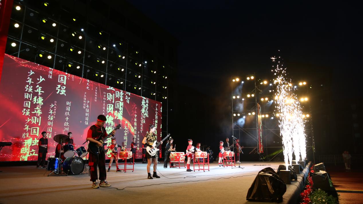暖场节目《自强》《一起向未来》正式拉开了晚会序幕。吉他、架子鼓、中国鼓、竹笛、唢呐交错映衬的震撼演奏,学生和老师的紧密配合充分展现了汉实师生昂扬向上的精神面貌。随着《一起向未来》的音乐律动,师生齐舞,瞬间将全场气氛点燃。
