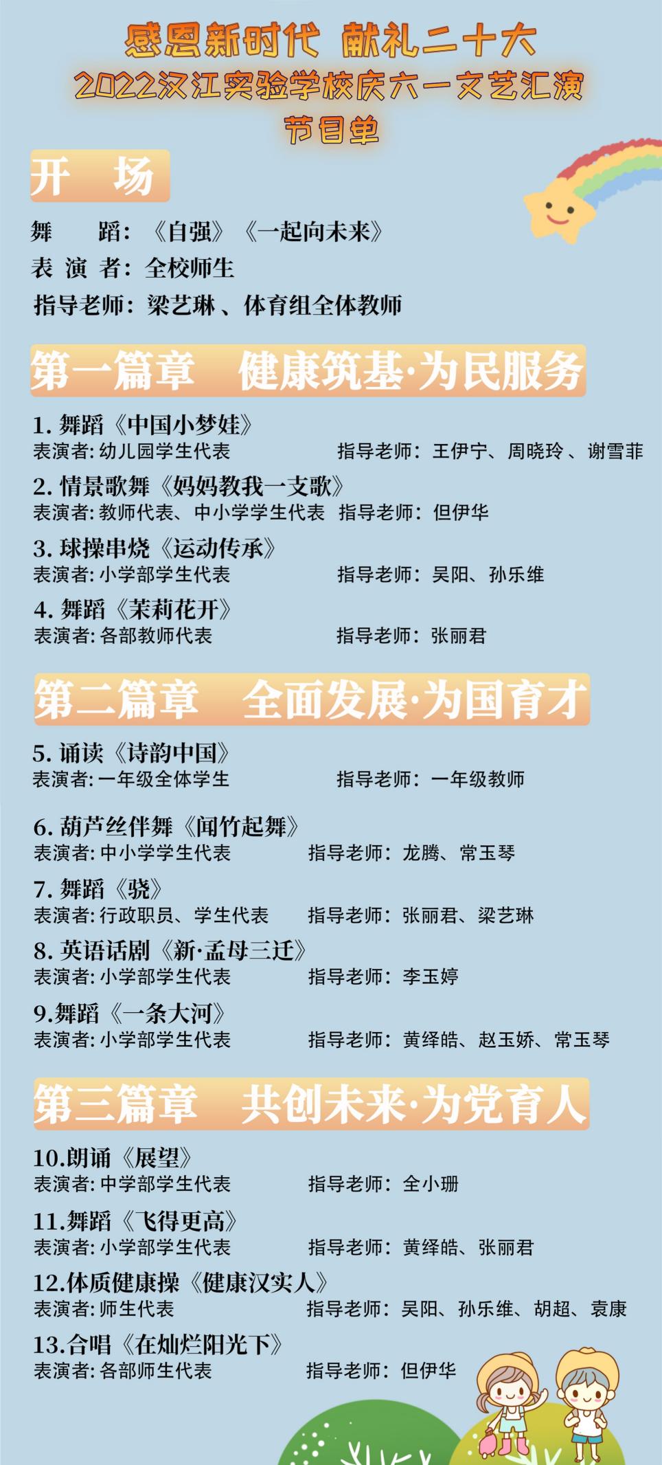 在气势如虹的大合唱旋律中,2022年庆六一文艺汇演圆满落下帷幕。本次活动,我校师生将爱党爱国情怀、汉实特色文化和师生风采风貌融入丰富多彩的节目表演中,展现了汉实师生蓬勃向上的精神面貌,彰显了我校为党育人、为国育才的使命担当。不忘初心,牢记使命。我校将紧随党和国家的步伐,坚持“崇文尚武——做具有世界交往能力的中国人”的核心理念,培育更多德智体美劳全面发展的优秀人才。汉江实验学校祝愿所有孩子们六一儿童节快乐!