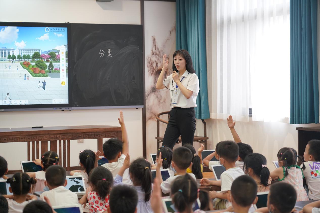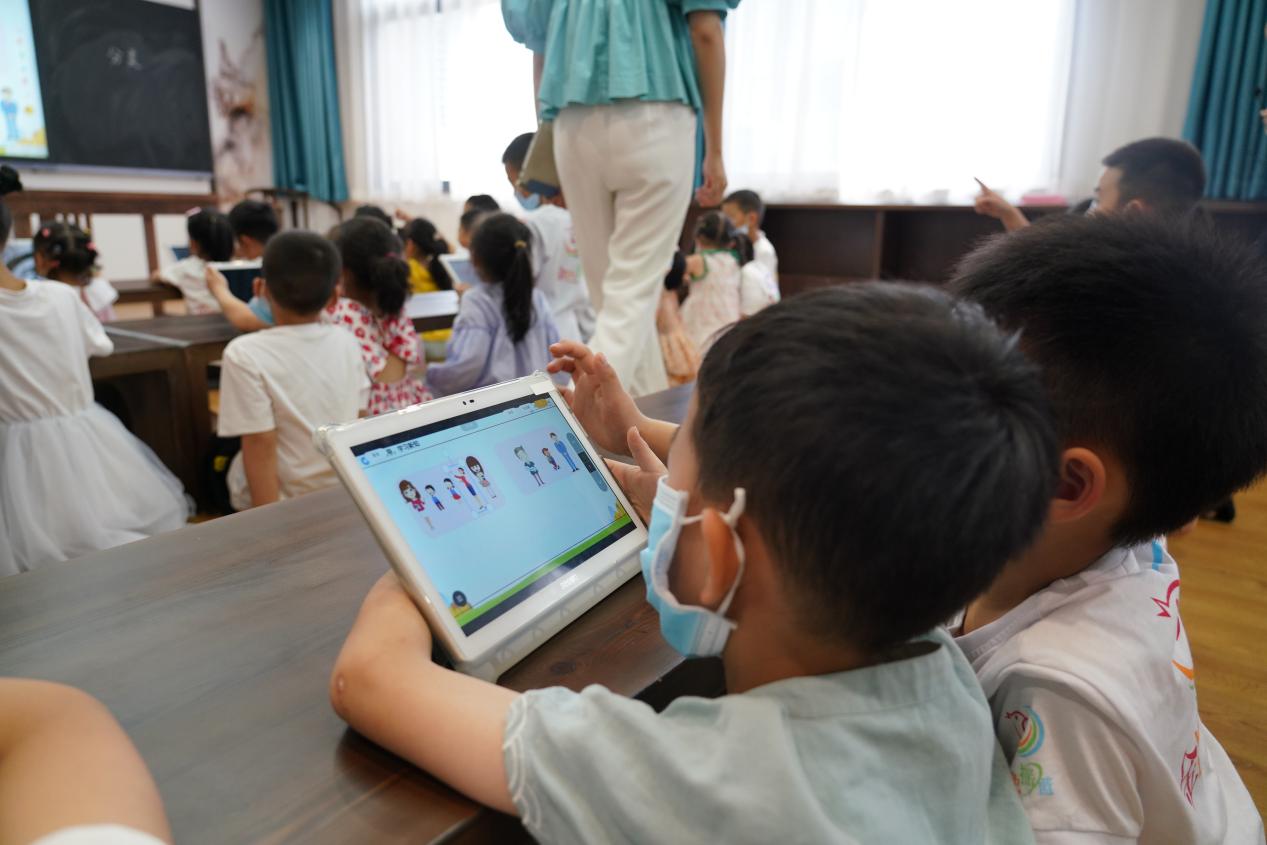 在国学教室,孩子们参与一年级智慧课堂展示课,感受幼儿园与小学课堂的不同。课堂上,他们认真倾听老师的讲授,积极举手与老师互动,课堂氛围轻松活跃。