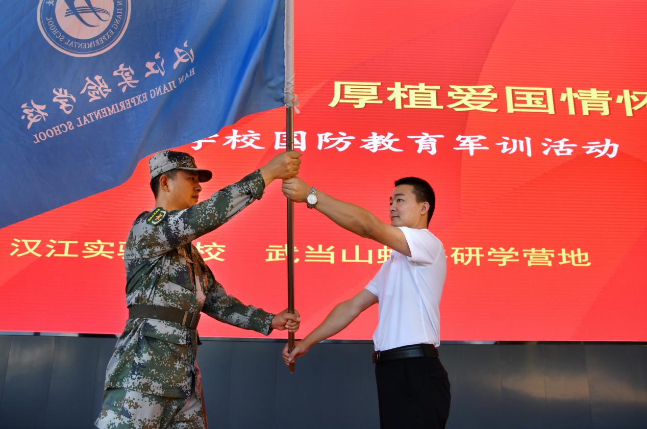 汉江实验学校初中部校长杨志向军训总教官授旗