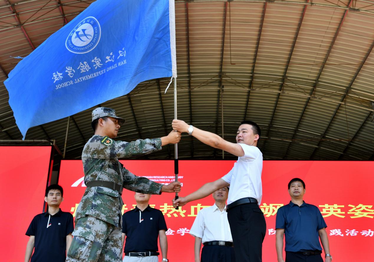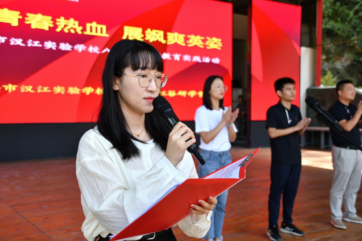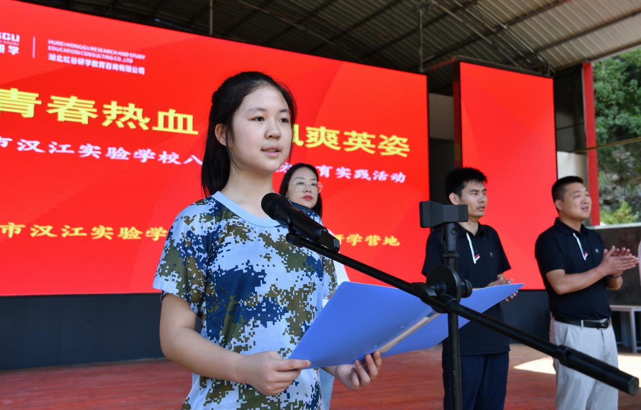 伴随着庄严的国歌声,五星红旗在训练场上冉冉升起,汉江实验学校八年级全体学生身着戎装、精神抖擞、队伍齐整。王甜甜老师主持开营仪式。