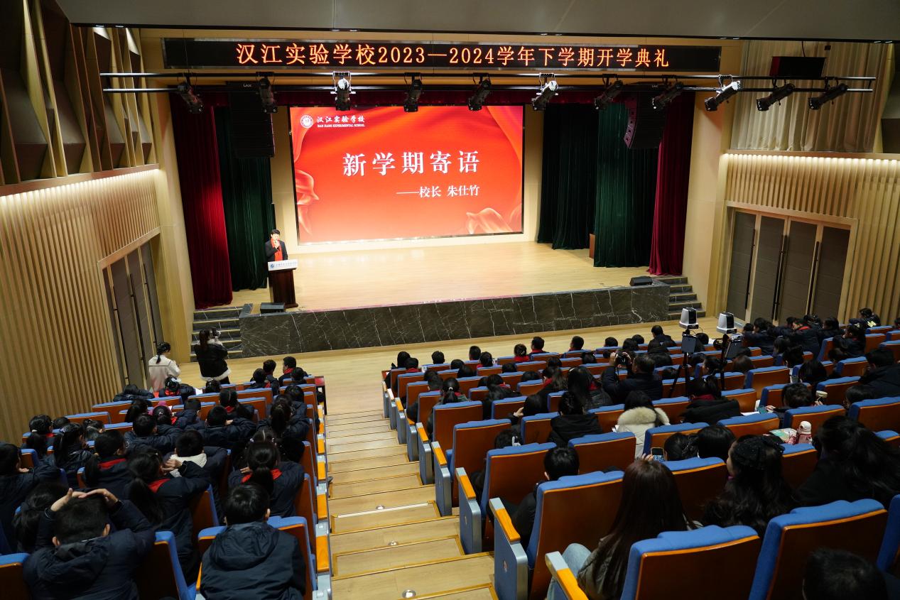 国旗飘扬,国歌嘹亮。2月27日上午,汉江实验学校在报告厅隆重举行2023-2024学年下学期开学典礼。党支部书记陈伟、校长朱仕竹等校领导出席,300余师生代表参加。本次活动以现场直播的形式,组织学生和家长在线上观看。