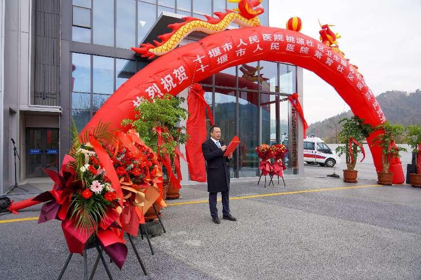 开业仪式上,张湾区汉江街办十里桃源社区卫生服务中心、十堰市人民医院紫霄社区医院正式揭牌,市人民医院党委副书记、院长孙泽群代表人民医院讲话。
