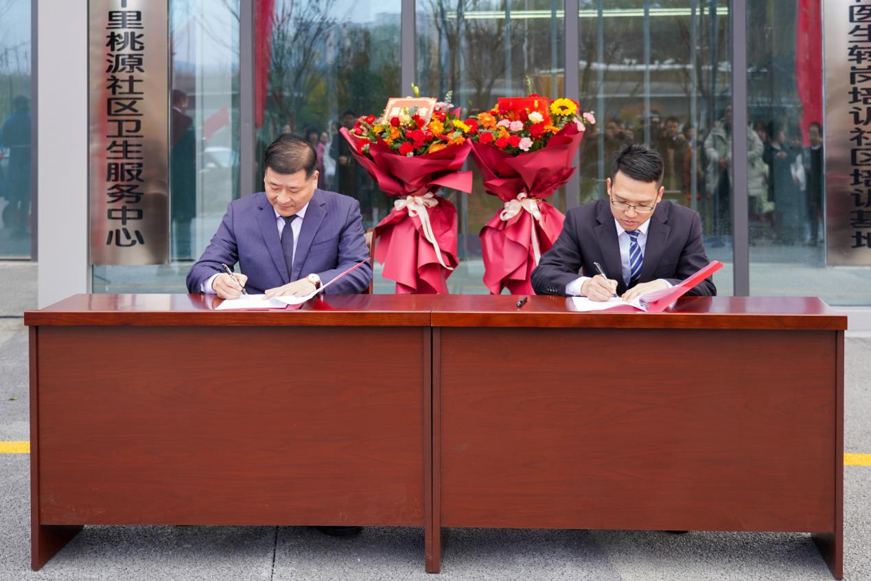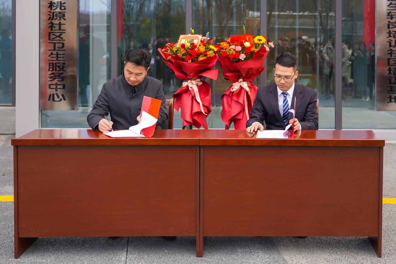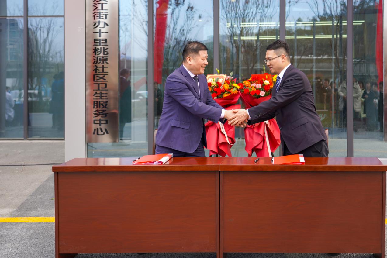 十里桃源社区卫生服务中心、社区医院负责人曾俊分别与汉江实验学校、市奥体中心、浙江大家物业服务集团有限公司湖北分公司、市城控步道建设开发有限公司、汉江街办熊家湾村卫生服务站等合作伙伴进行了合作签约。
