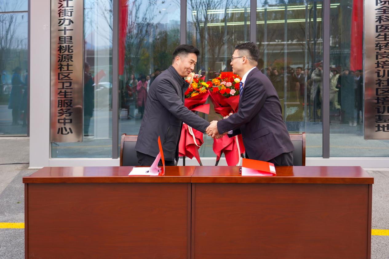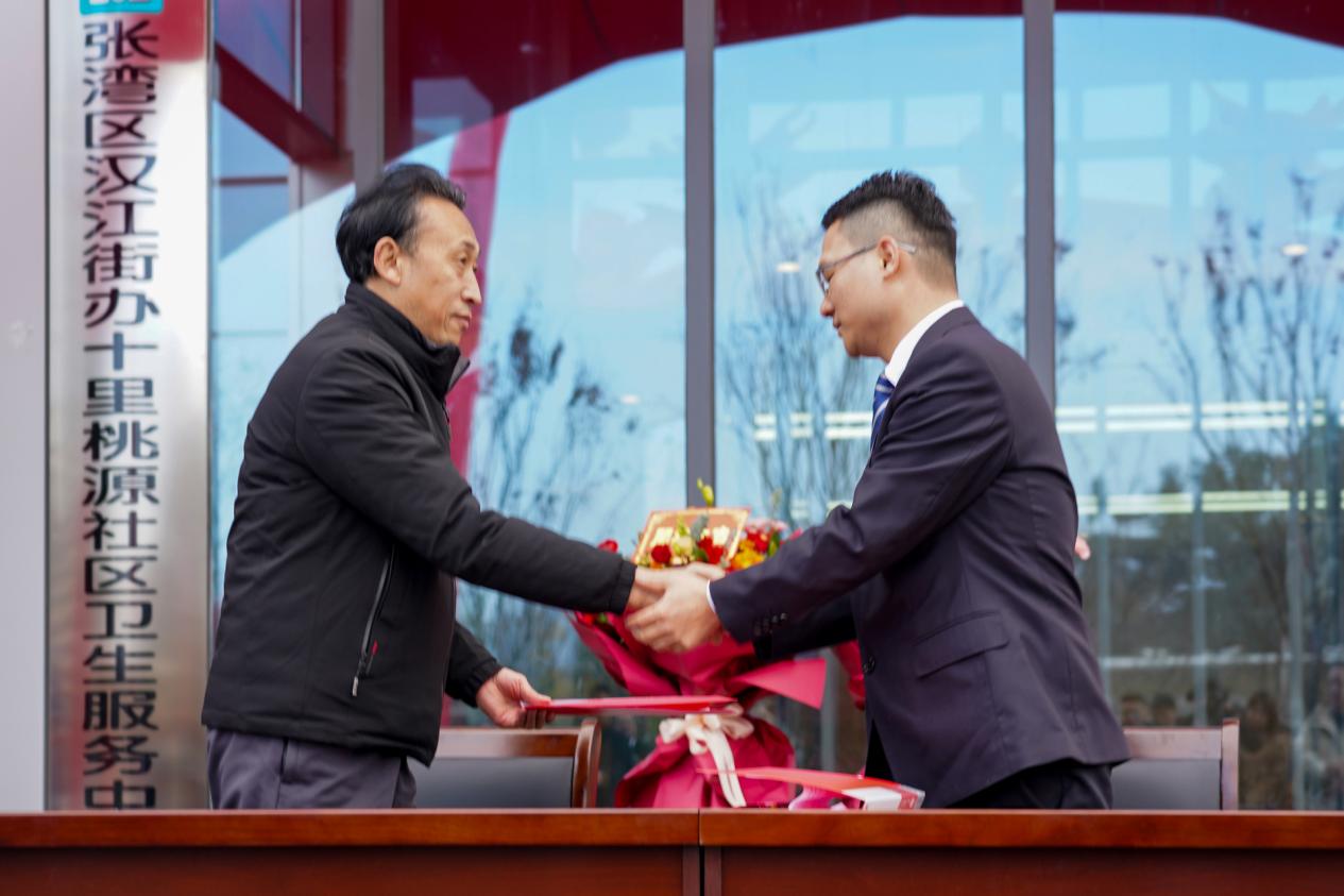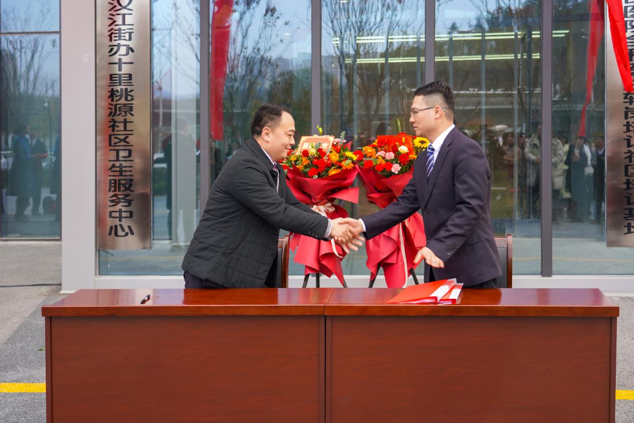 十里桃源社区卫生服务中心、社区医院负责人曾俊分别与汉江实验学校、市奥体中心、浙江大家物业服务集团有限公司湖北分公司、市城控步道建设开发有限公司、汉江街办熊家湾村卫生服务站等合作伙伴进行了合作签约。