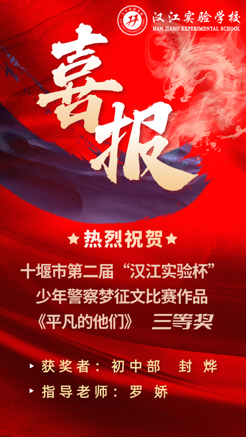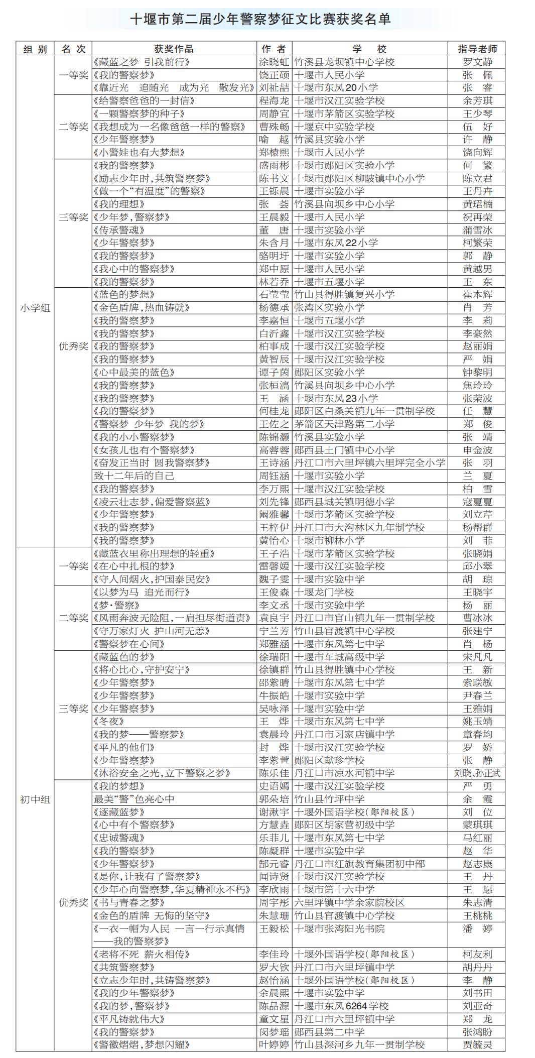 由十堰市公安局、十堰市教育局联合主办,十堰日报社、十堰市张湾汉江实验学校承办的“立志少年时 共筑警察梦——十堰市第二届‘汉江实验杯’少年警察梦征文比赛”活动圆满落幕。此次活动共收到全市中小学生积极投稿3000余篇。经过初评及专家评委评定,76篇作品从中脱颖而出,其中6篇文章获得一等奖,10篇文章获得二等奖,20篇文章获得三等奖,其余40篇文章获得优秀奖。