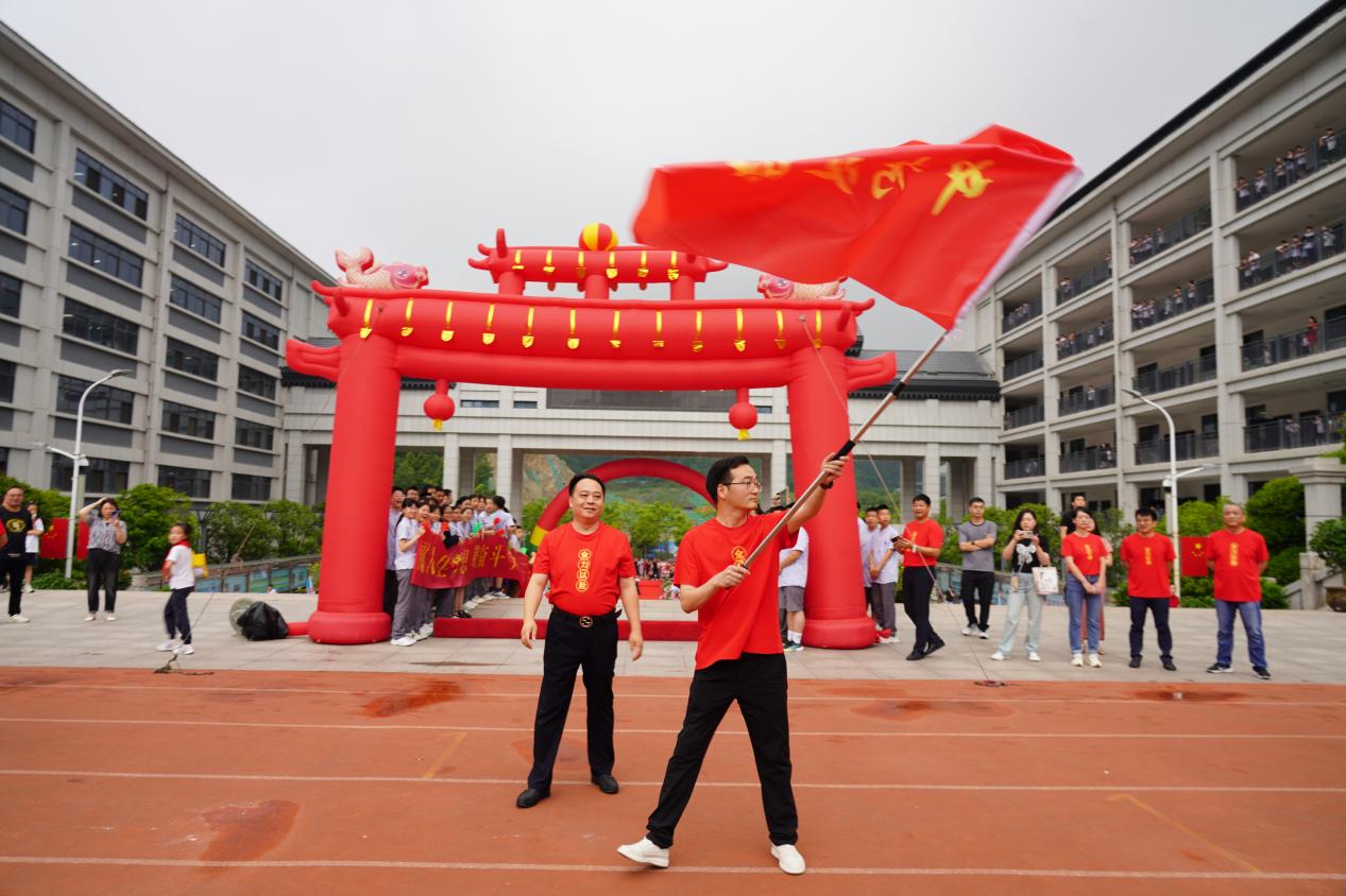 党支部书记、董事长陈伟,总校长朱仕竹为九年级授出中考出征战旗,师生家长,心潮澎湃,共同祈愿汉实学子们乘风破浪,无畏挑战,决胜中考!
