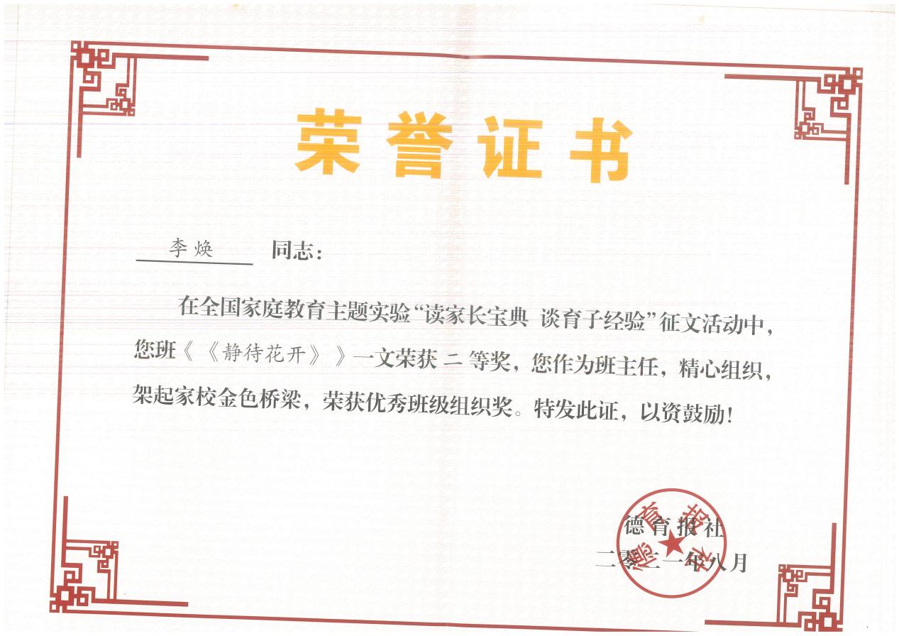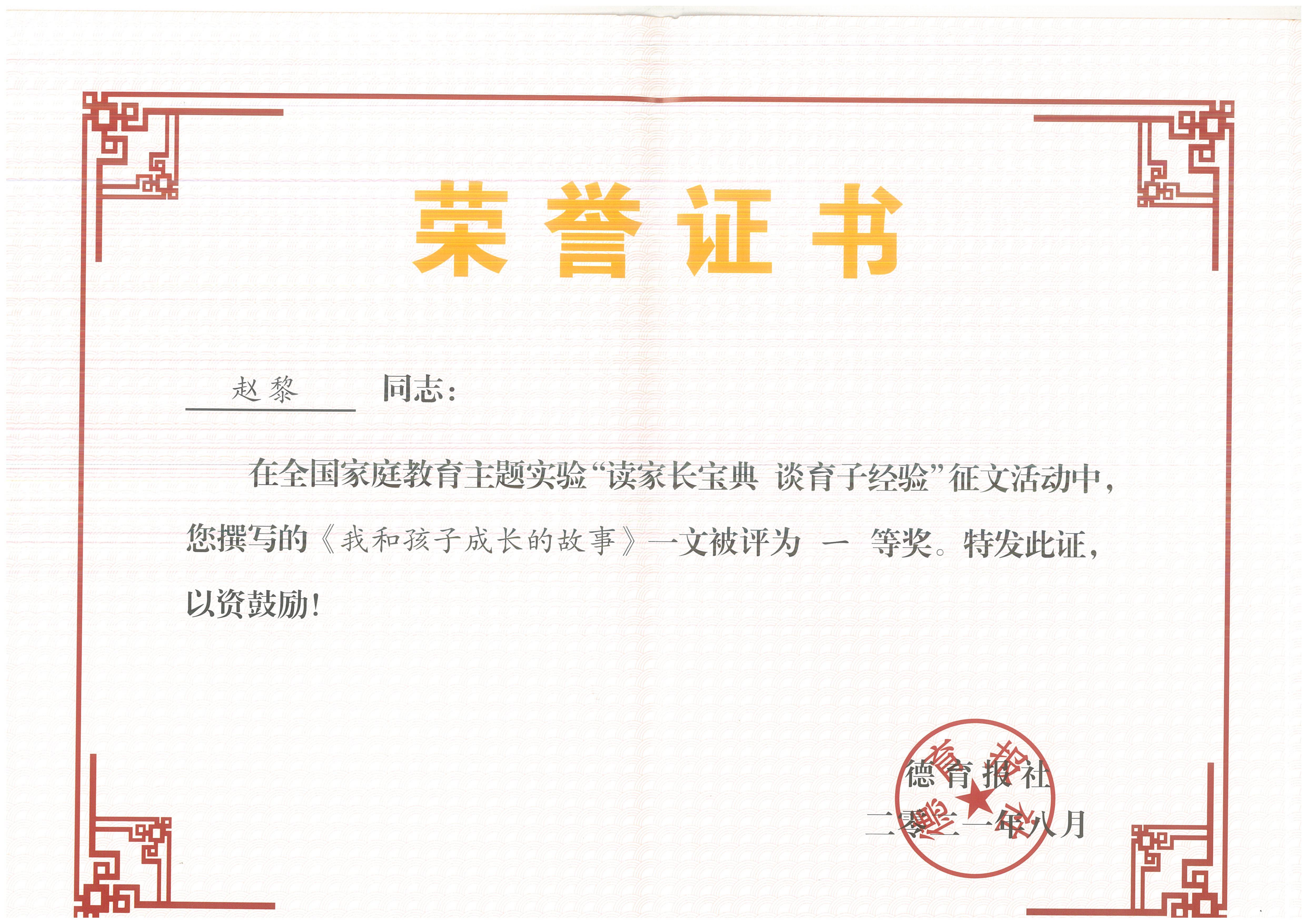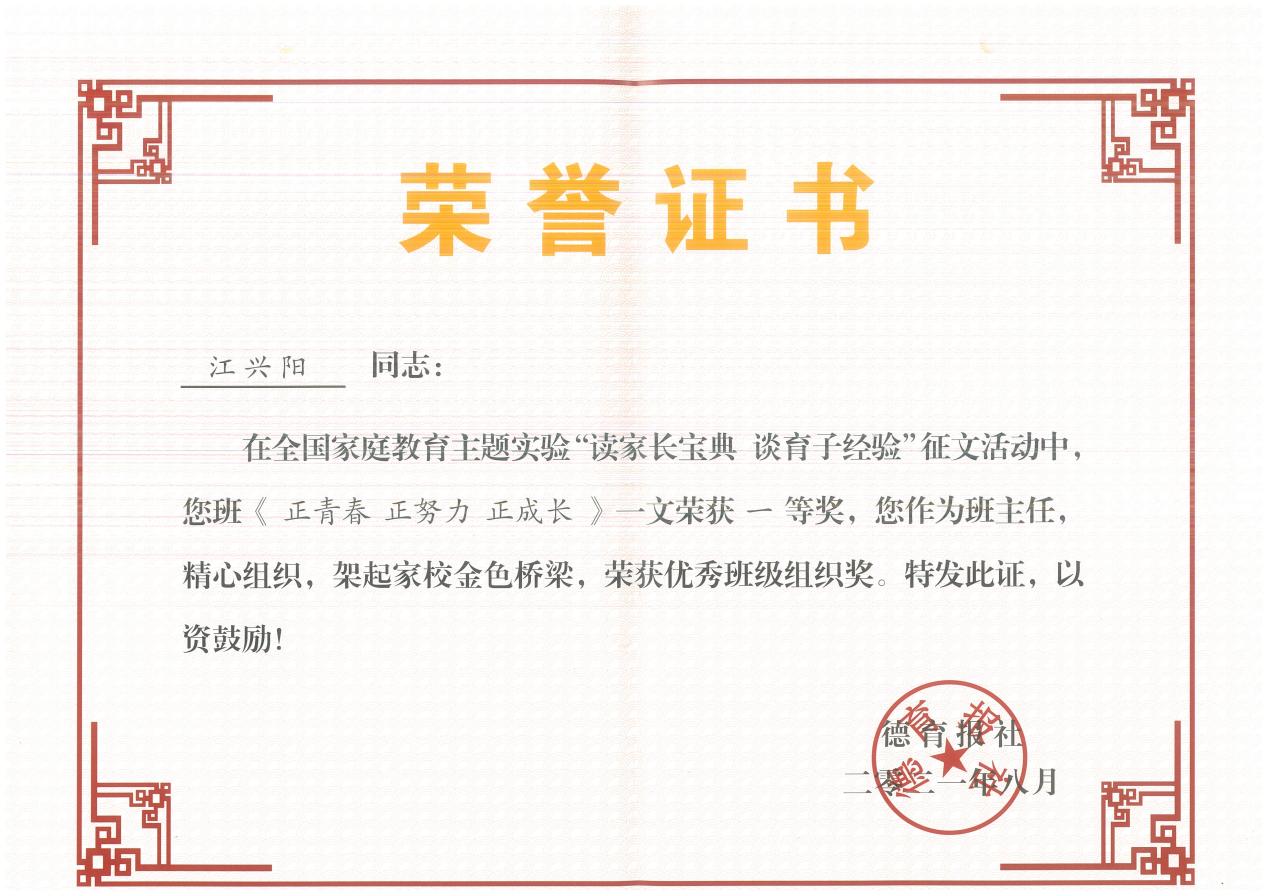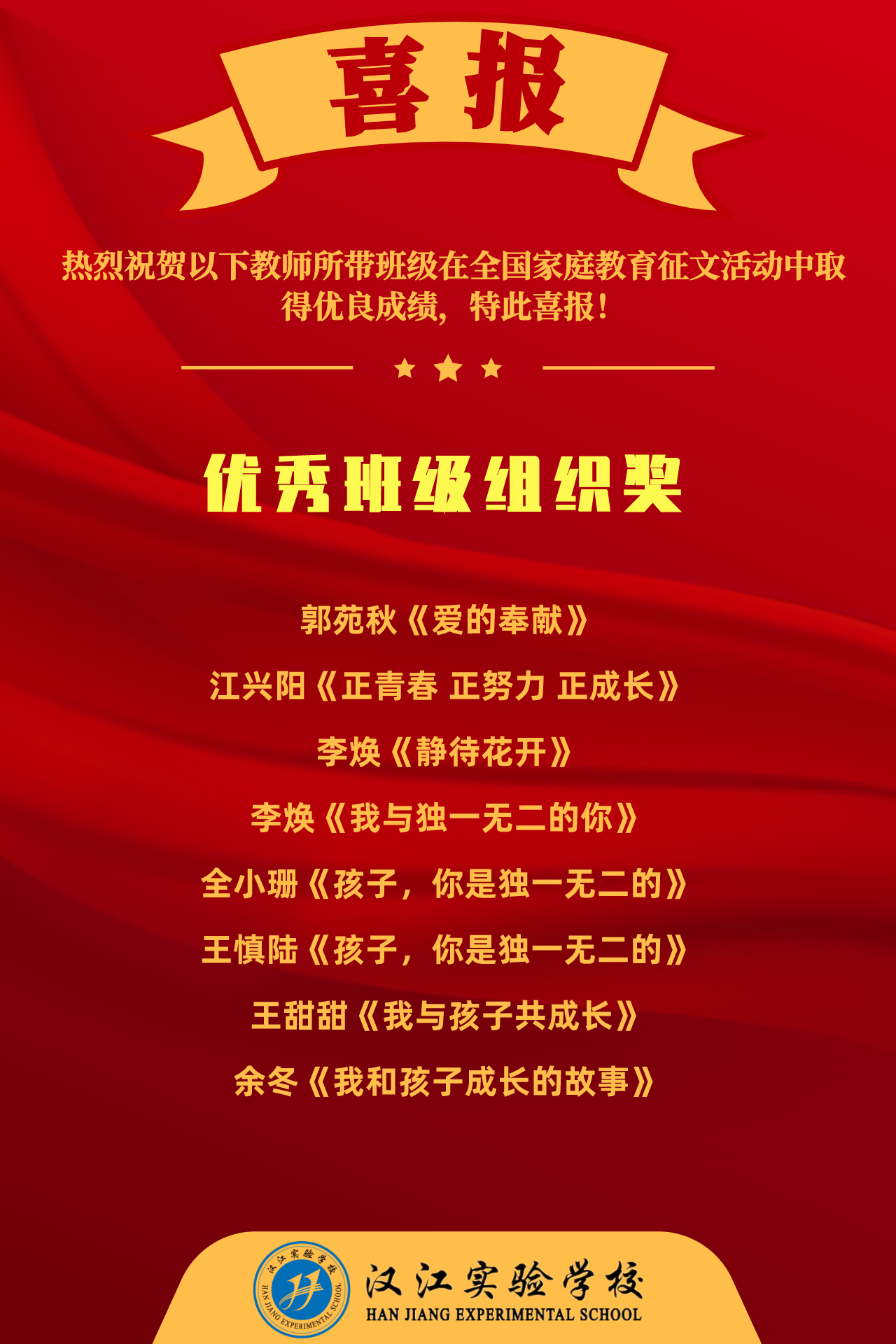为积极响应习近平总书记“注重家庭、注重家教、注重家风”的号召,创设良好的家庭教育氛围,汉江实验学校组织学生家长及老师参与由德育报社主办的全国家庭教育征文活动,均取得优异成绩。本次活动为学生们健康成长营造了良好的家庭和学校环境,为推进我校做好家校沟通,形成家庭教育合力奠定了坚实基础。