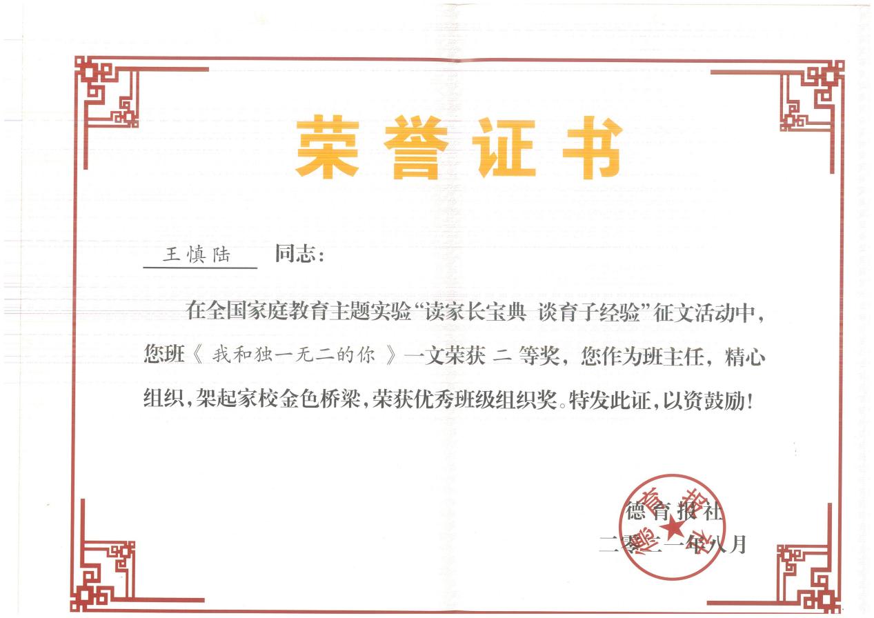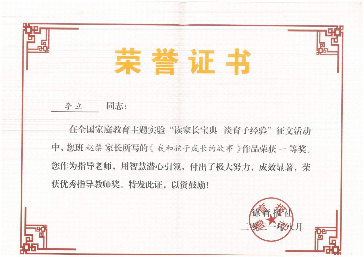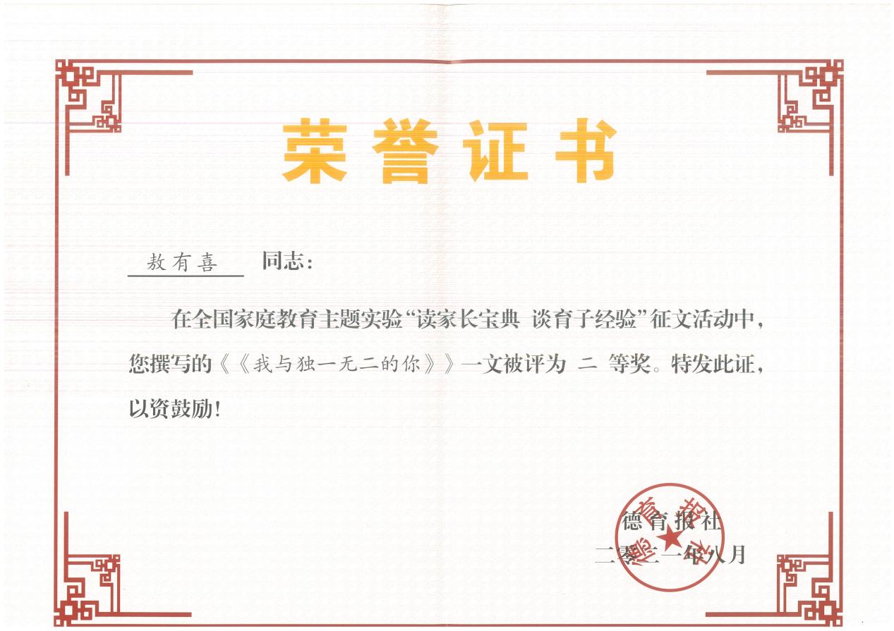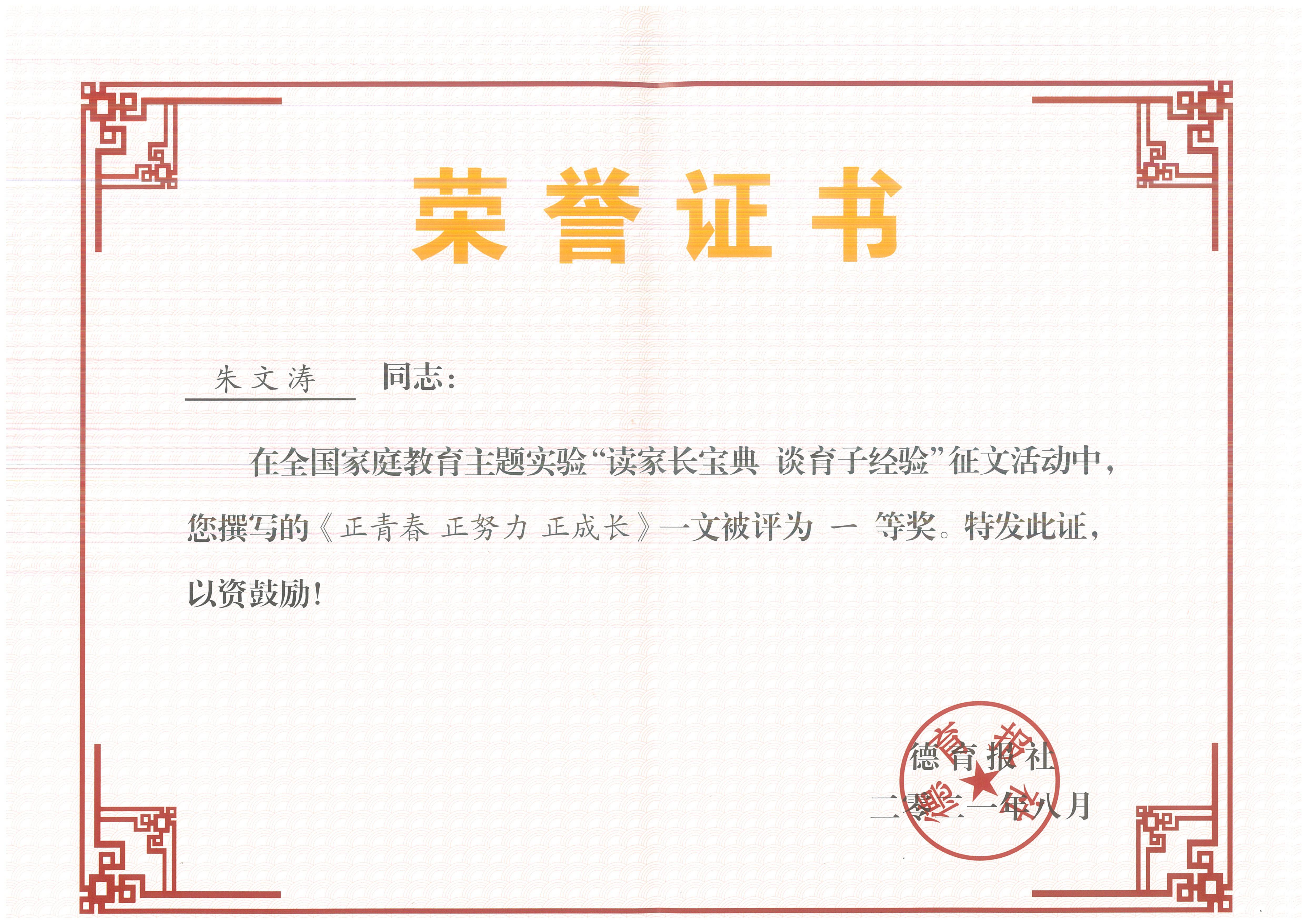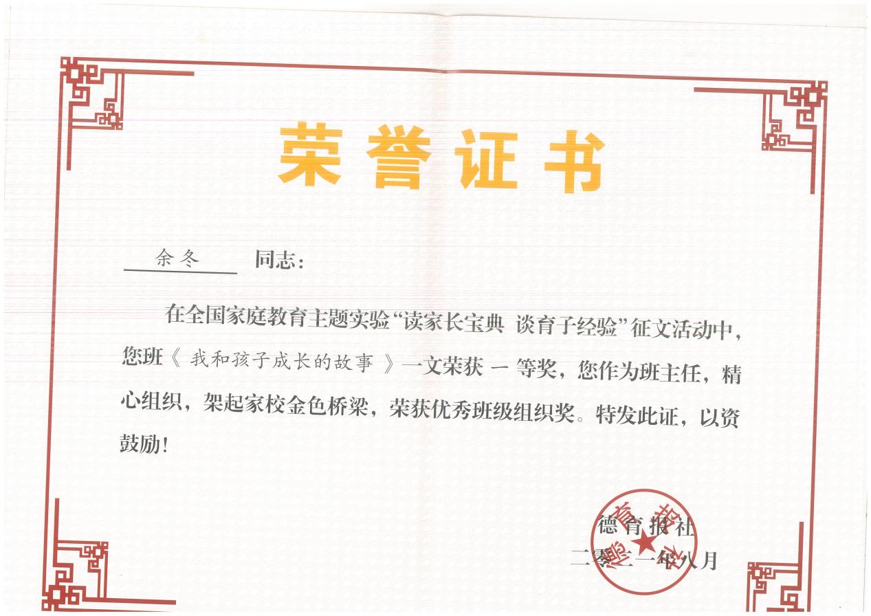 为积极响应习近平总书记“注重家庭、注重家教、注重家风”的号召,创设良好的家庭教育氛围,汉江实验学校组织学生家长及老师参与由德育报社主办的全国家庭教育征文活动,均取得优异成绩。本次活动为学生们健康成长营造了良好的家庭和学校环境,为推进我校做好家校沟通,形成家庭教育合力奠定了坚实基础。
